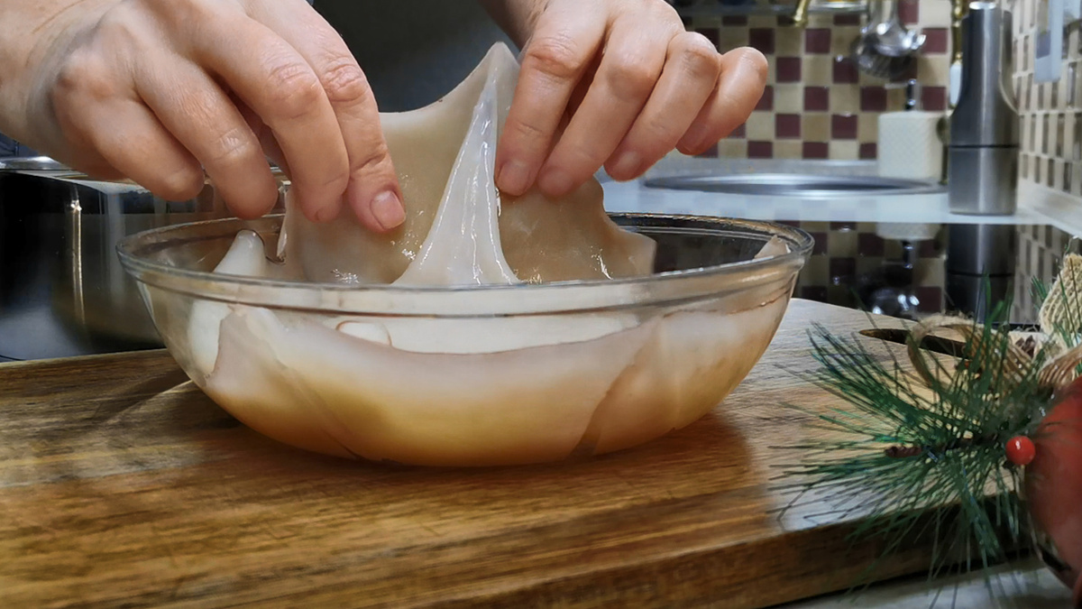 Приготовление начинается с варки кальмаров. В воду добавляется соленый лимонный сок и ароматные специи: черный перец горошком и лавровый лист. Кальмары отвариваются всего полторы-две минуты, что позволяет сохранить их нежность, а затем охлаждаются в холодной воде для остановки готовки.