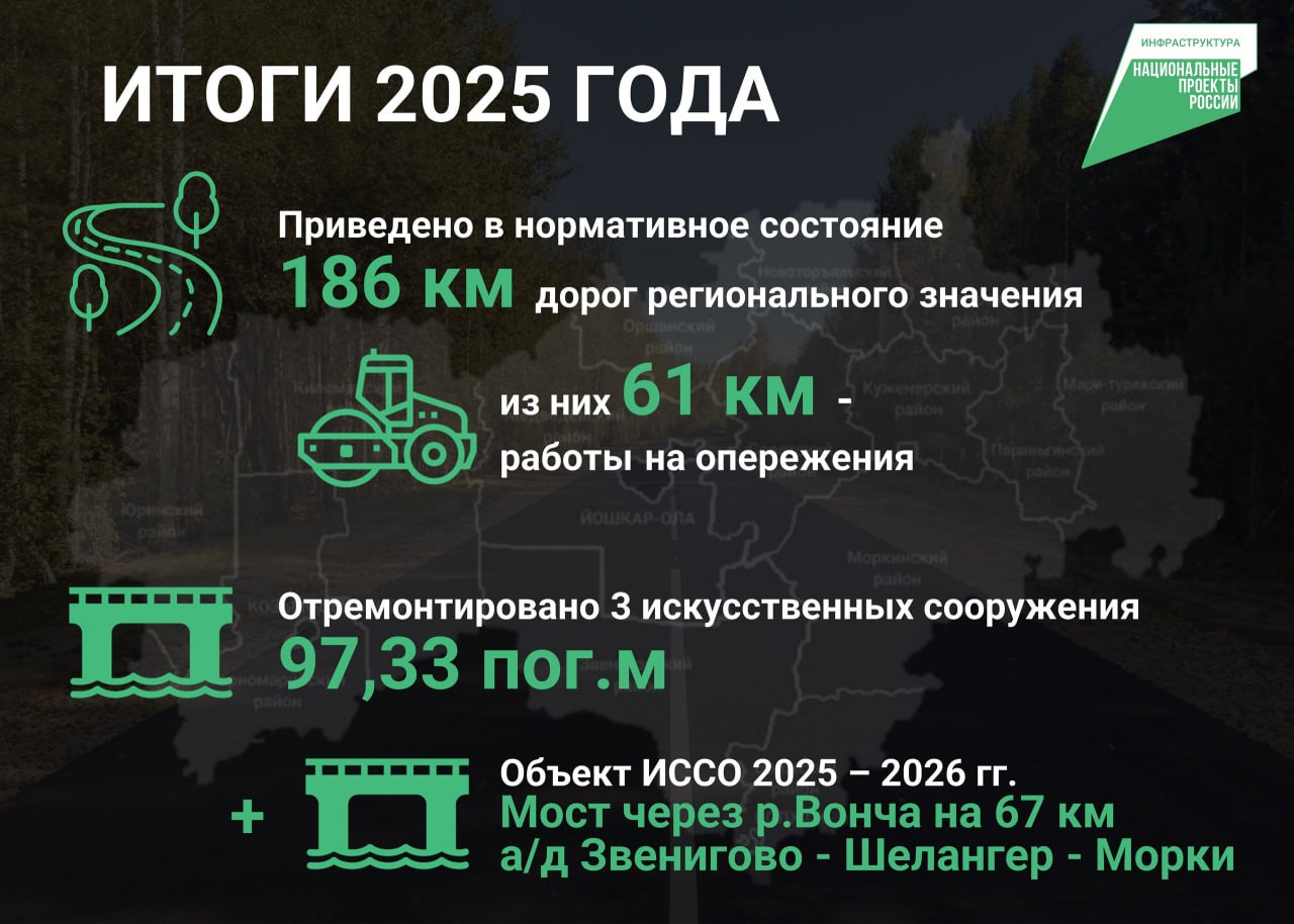 Было реализовано два капиталоемких объекта реконструкции: мост через реку Немда на 71 километре дороги Йошкар-Ола – Уржум, и мост через реку Ексейка на 57 километре автодороги Оршанка –Пектубаево – Новый Торъял.