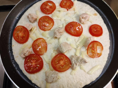 Разогрейте сковороду с антипригарным покрытием на сильном огне, затем убавьте до среднего. Начните с первой тортильи, на которую равномерно положите немного сыра, помидоры и курицу. Важно, чтобы жарка первой стороны не превышала двух минут, чтобы лепешка не подгорела.