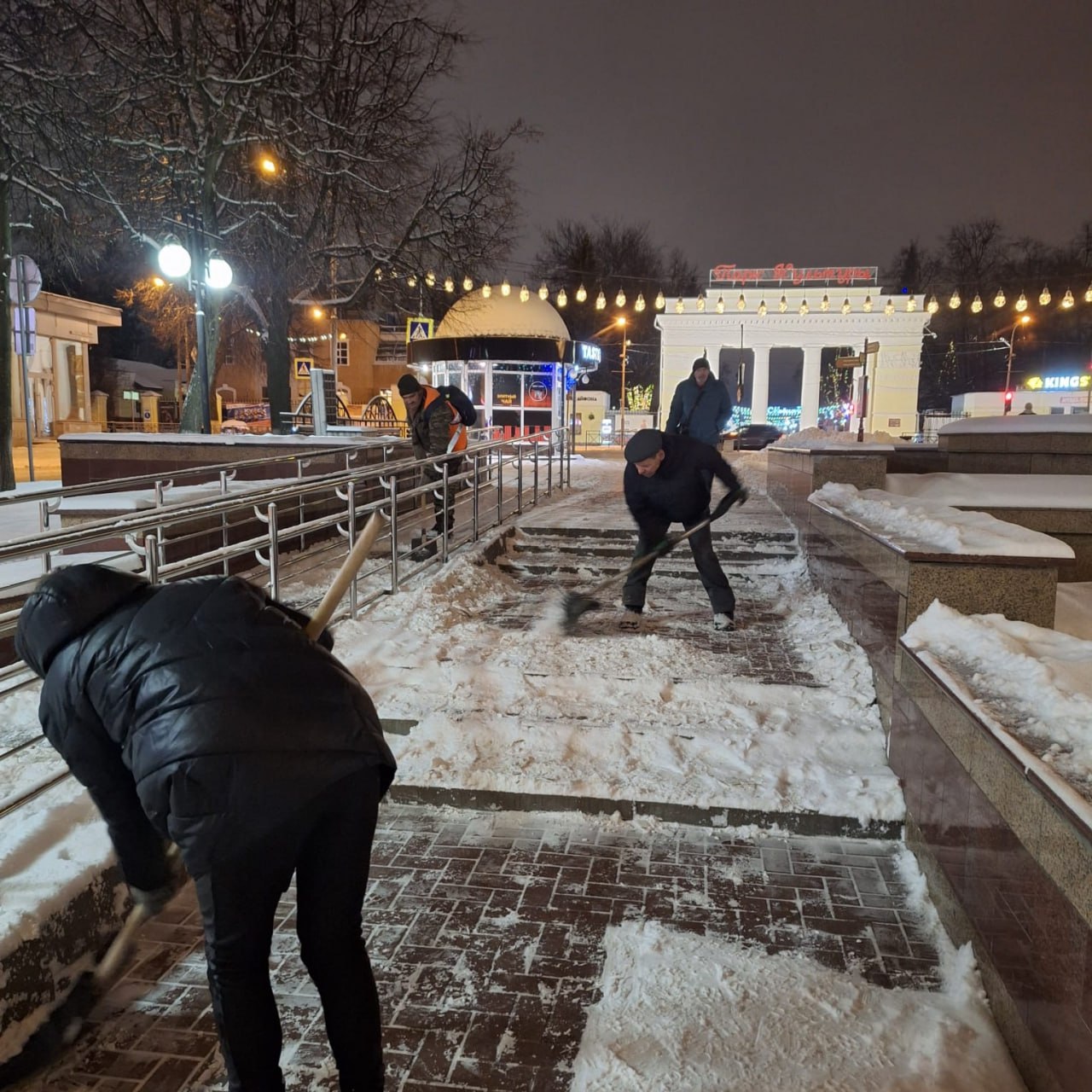 Параллельно с техникой трудятся люди: бригады вручную расчищают самые важные для пешеходов места — лестницы, остановки, подходы к переходам и общественные пространства.