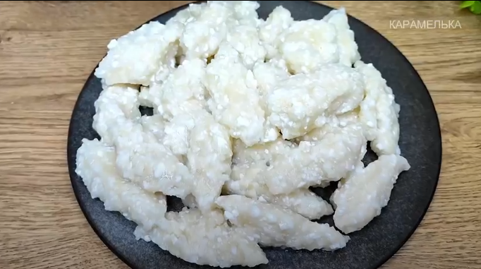 Теперь начинается самый интересный момент: не нужно лепить вареники! Достаточно погружать ложку в стакан с водой, затем в тесто и опускать в кипящую подсоленную воду. Как только вареники всплывут — варить их ещё 1–2 минуты и аккуратно вынимать с помощью шумовки.