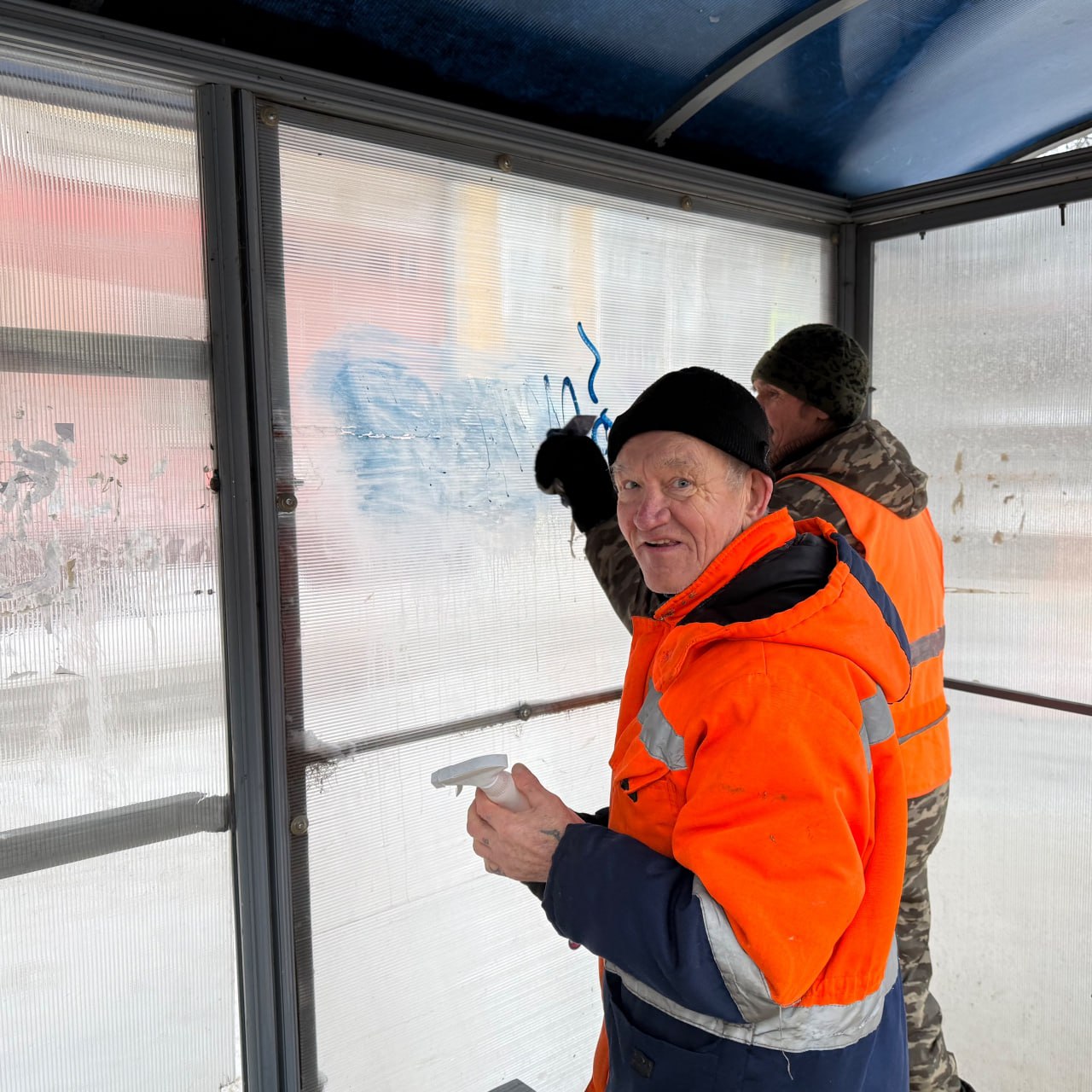 Альберт Аркадьевич – настоящий ветеран своего дела. Он трудится в АО "Город" уже более 10 лет, и за это время его руки привели в порядок не одну улицу, не один городской объект. Сейчас его задача – чистота на наших остановочных павильонах. К сожалению, полностью отмыть остановку от нанесенного клея или краски уже не получится, но он старается сделать все возможное.
