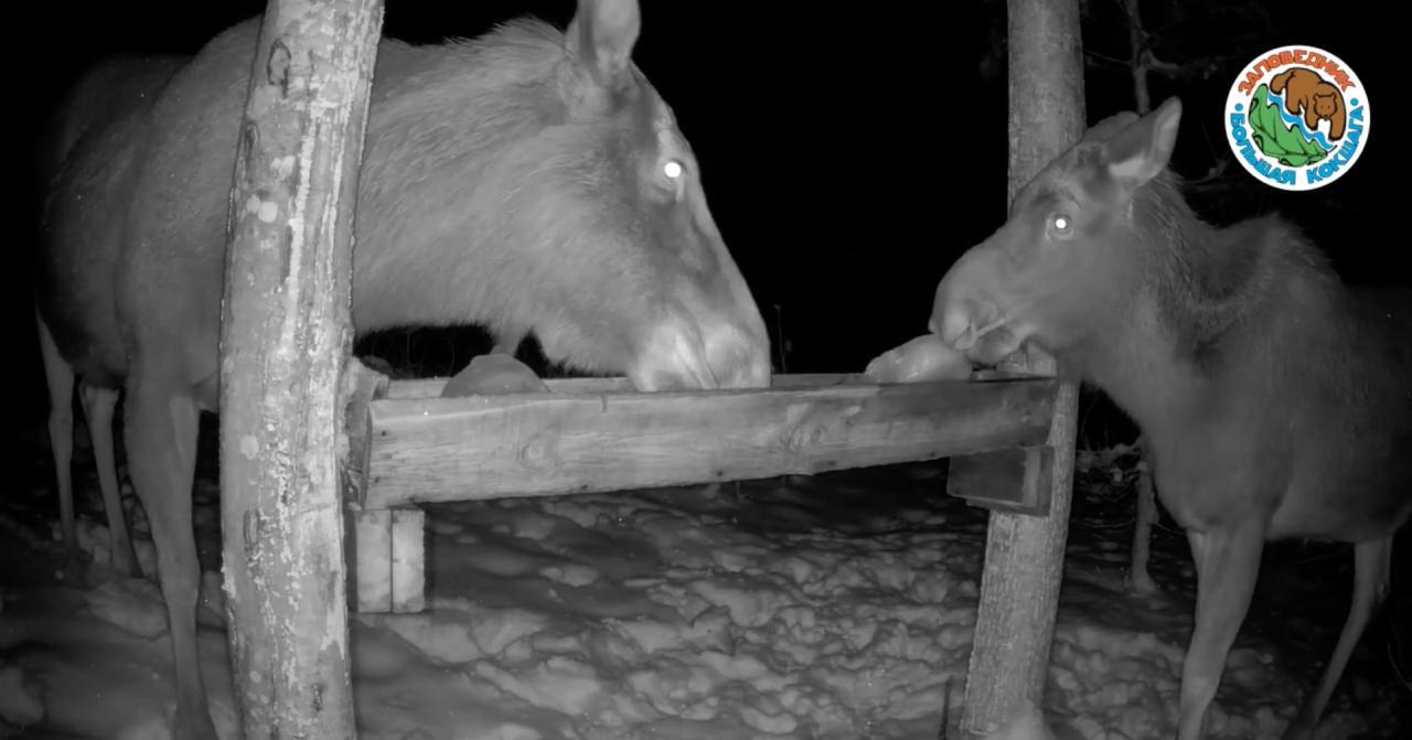 Солонец на экологической тропе близ деревни Шаптунга стал настоящим местом притяжения для диких обитателей. После одиночного визита лося-первопроходца фотоловушка зафиксировала сразу всю семью: маму-лосиху, папу-лося и, вероятно, подросшего лосёнка.