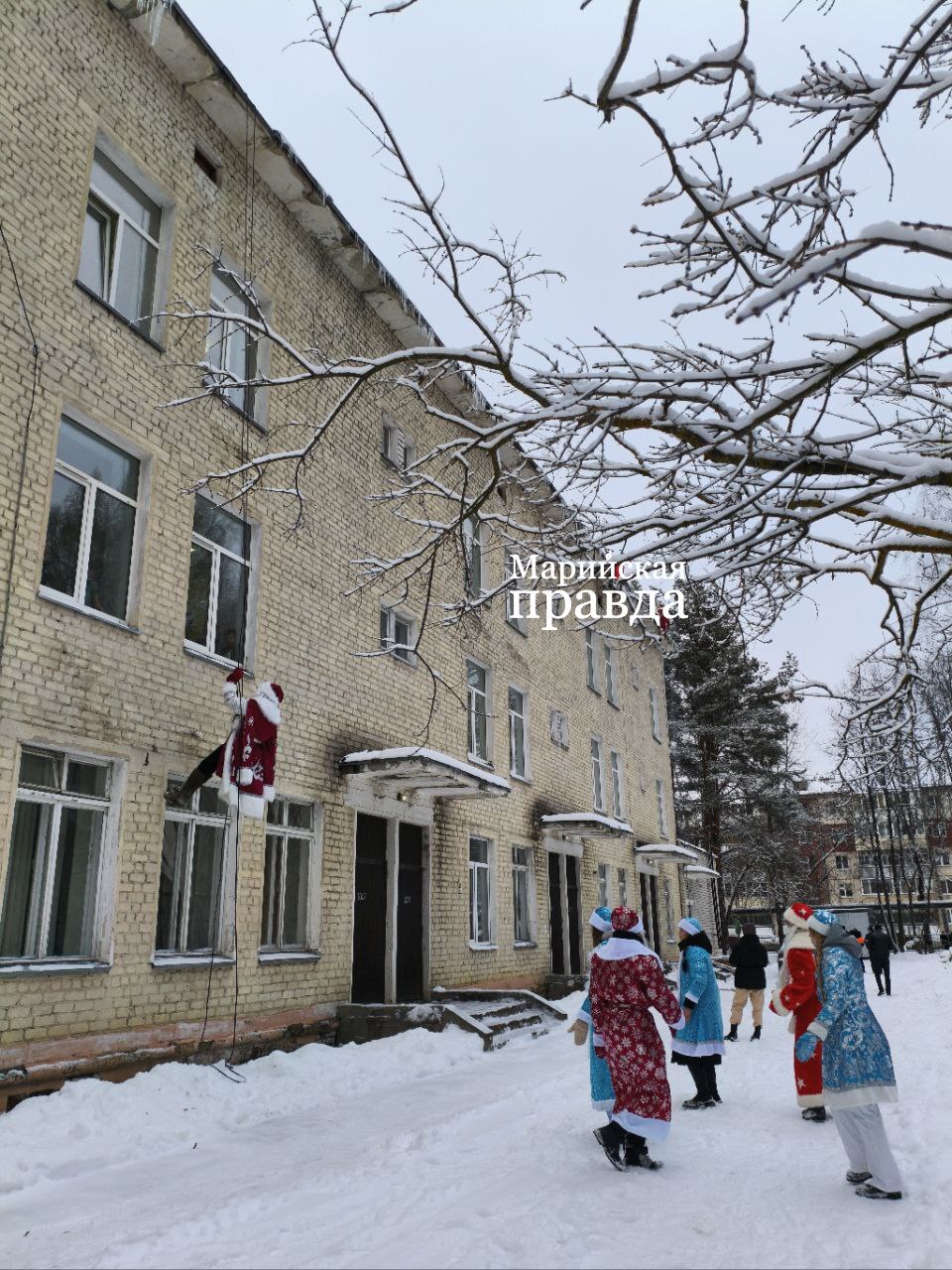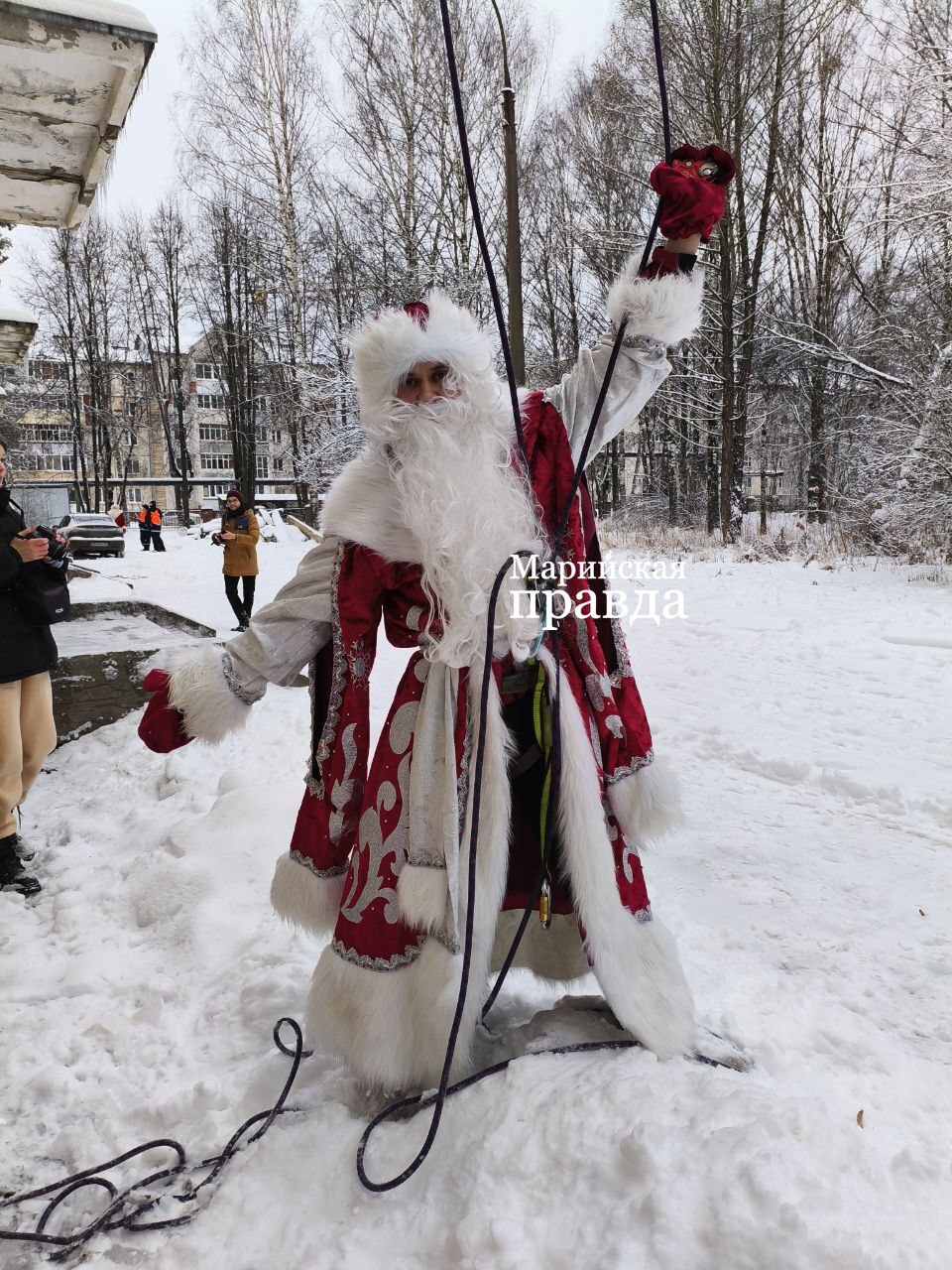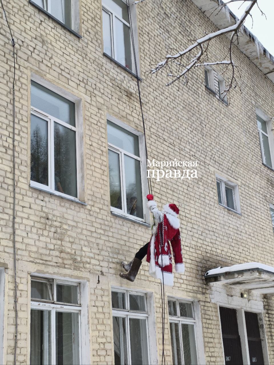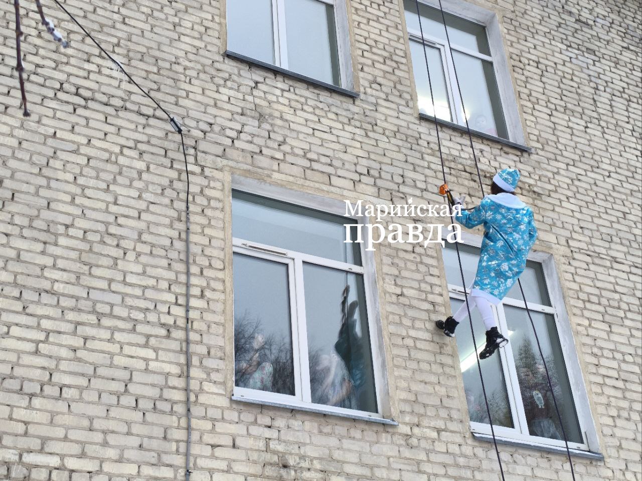 Студенты-спасатели ПГТУ и спасатели аварийной службы в костюмах Деда Мороза спустились с крыши инфекционного отделения прямо к окнам палат.