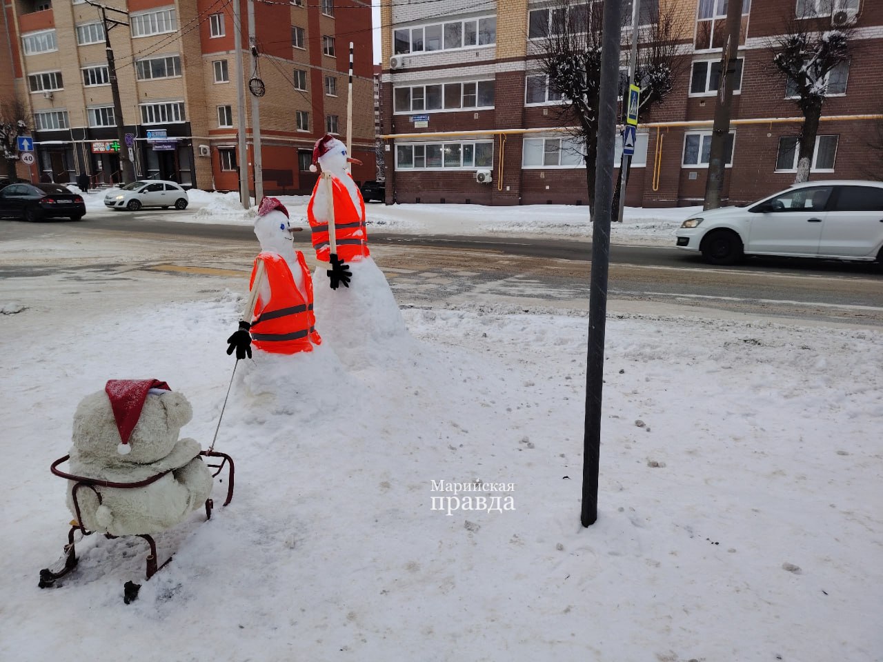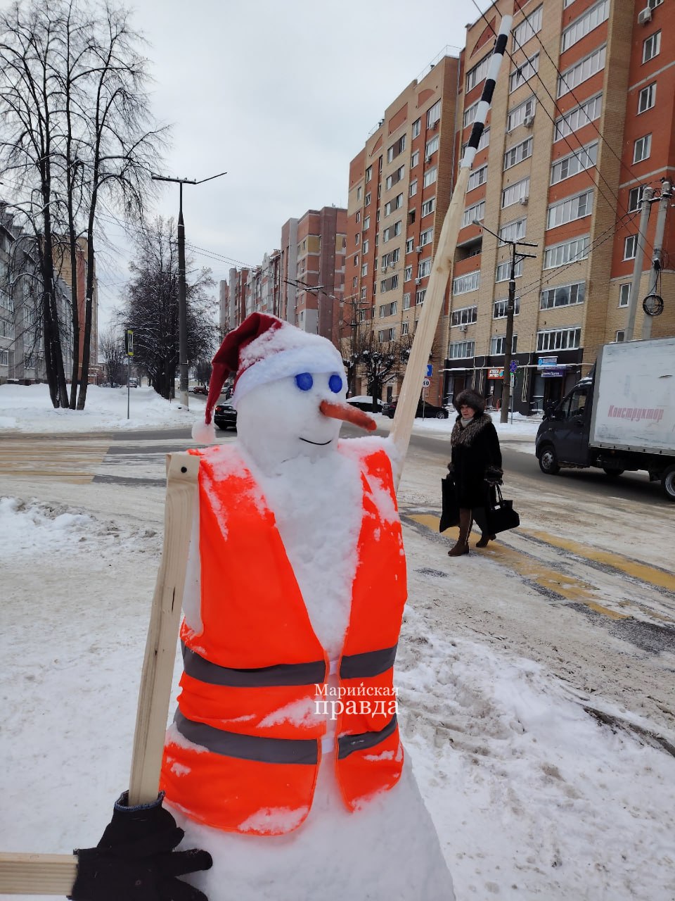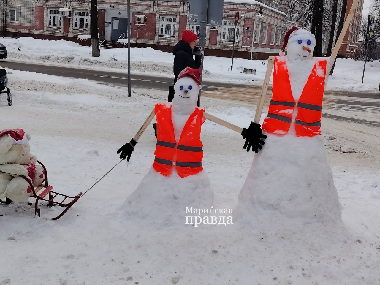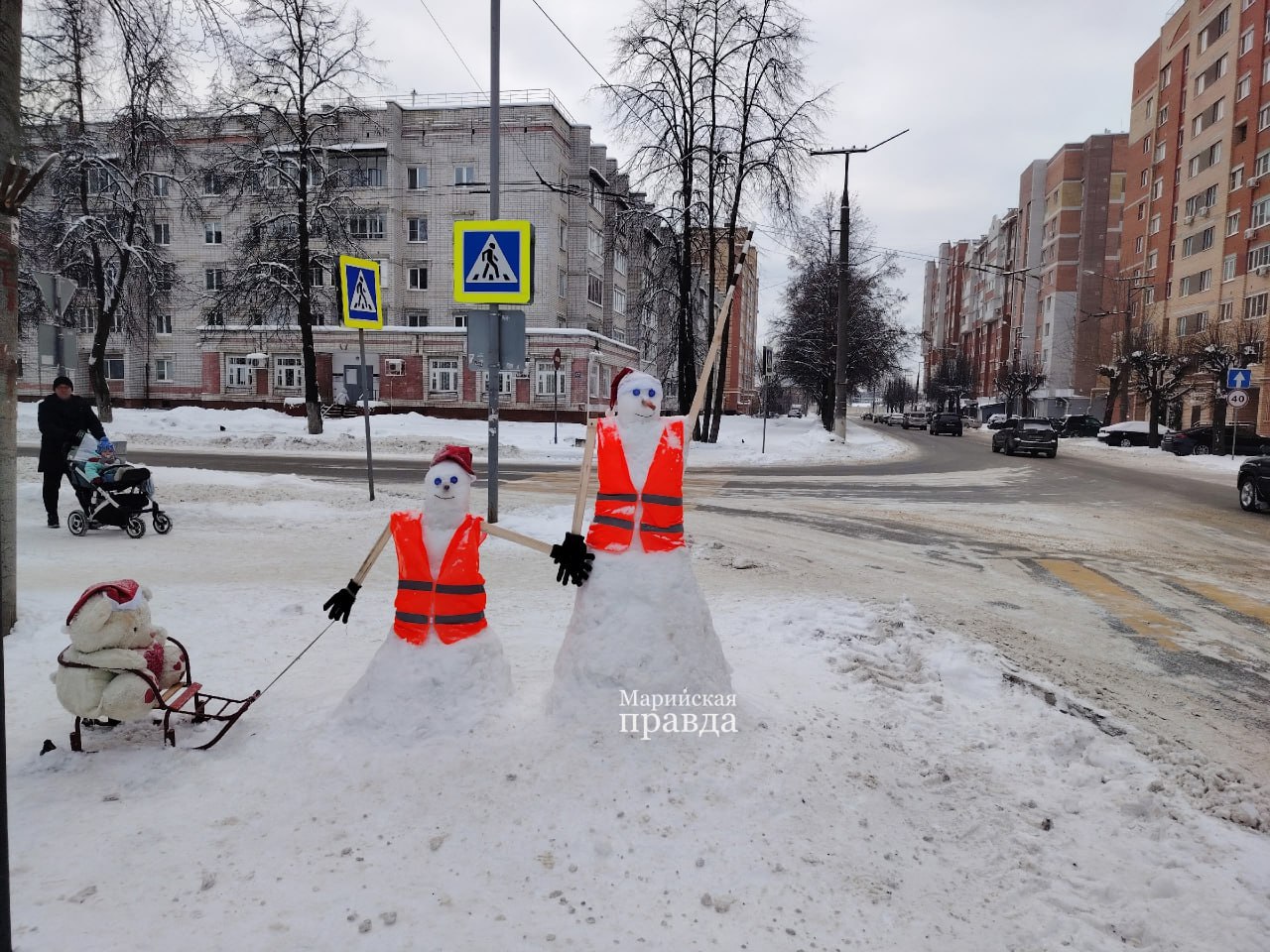 Уже не первый год в Йошкар-Оле на перекрестке улиц Анциферова и Суворова появляется необычная снежная инсталляция, предупреждающая водителей о необходимости притормозить возле пешеходного перехода.