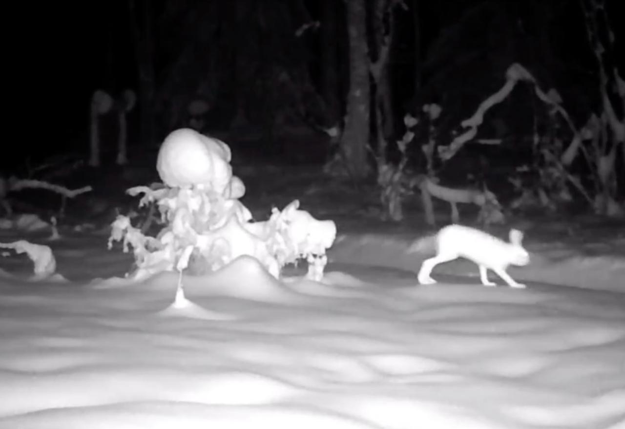 Сначала камера заметила зайца, внимательно прислушивающегося к каждому шороху в лесу. Он движется осторожно, приседает и останавливается, словно оценивая обстановку, стараясь не попасться в поле зрения хищника.