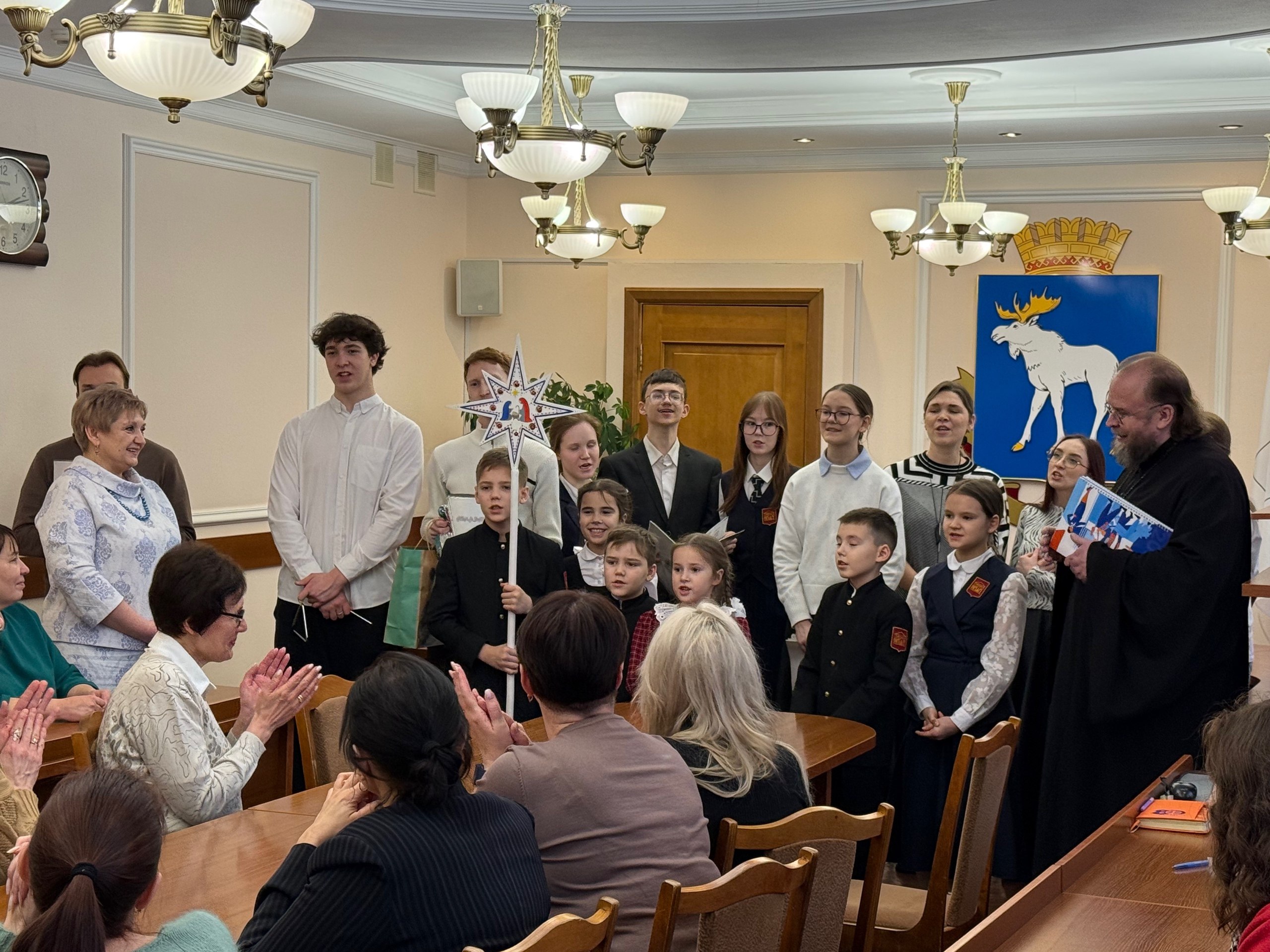По сложившейся традиции воспитанники гимназии им. Сергия Радонежского вместе с протоиереем Евгением Сурковым пришли в мэрию Йошкар-Олы, чтобы поздравить её сотрудников с Рождеством.