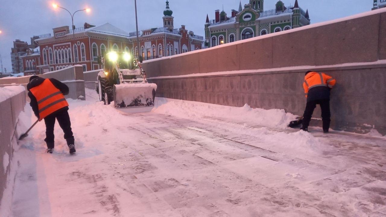 Днем на улицах столица работали 44 единицы техники и бригады ручного труда. Отдельная работа проводится на набережной, потому что она является главным туристическим маршрутом Йошкар-Олы.