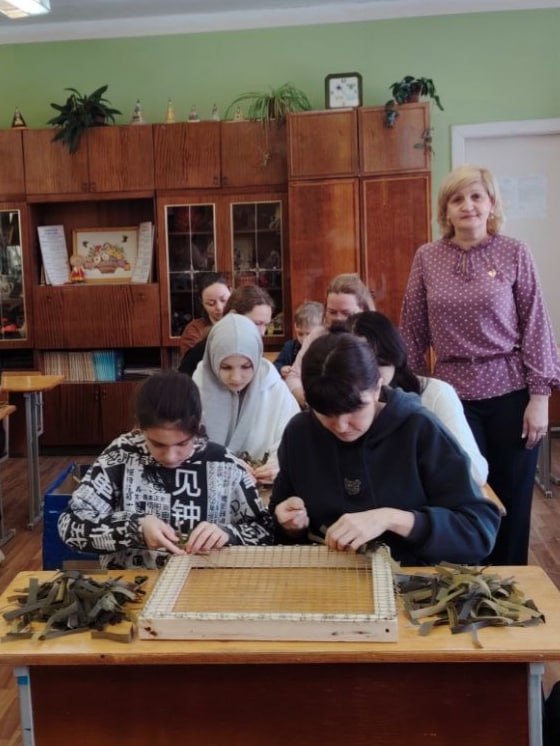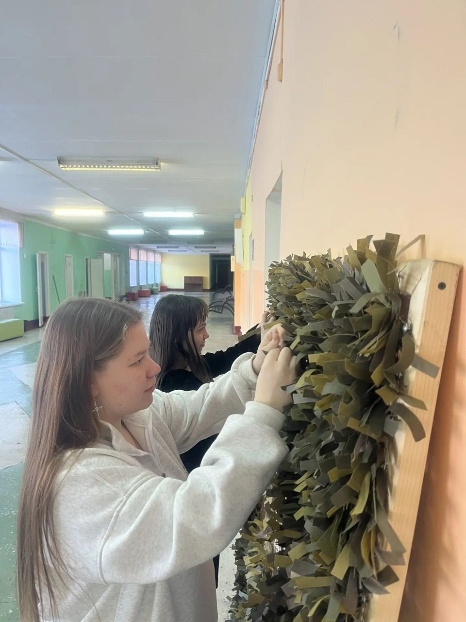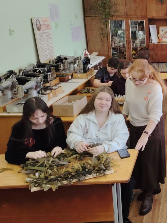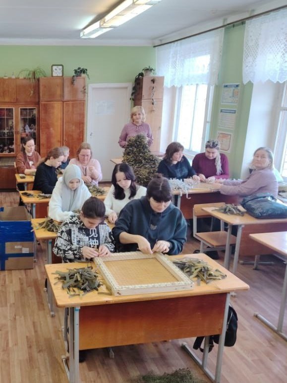 Учитель технологии лицея Виктория Осокина собрала неравнодушных горожан на мастер-класс по плетению маскировочных накидок для наших бойцов.
