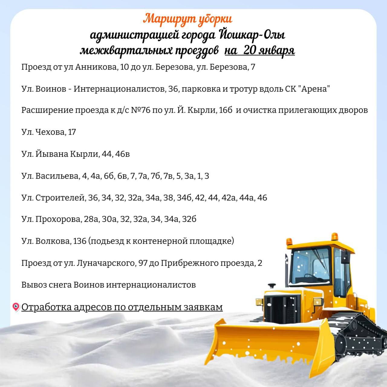 Мэрия Йошкар-Олы опубликовала планируемый маршрут движения снегоуборочной техники по расчистке межквартальных проездов на 20 января.