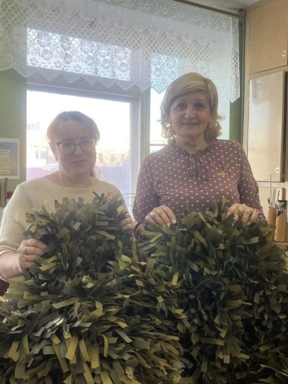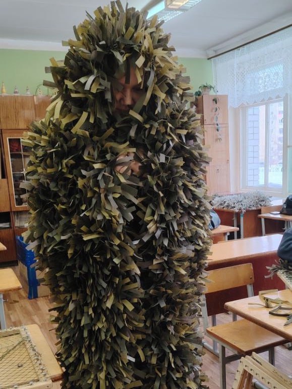 В лицее № 28 Йошкар-Олы учитель технологии Виктория Осокина провела мастер-класс по плетению маскировочных накидок для участников специальной военной операции.