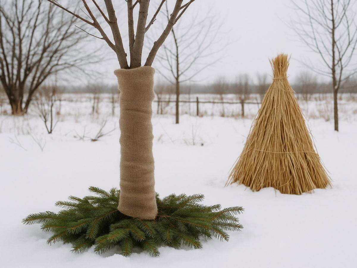 Еще один важный момент — мульчирование приствольных кругов перегноем: это сохраняет влагу и уменьшает промерзание корней. Также стоит позаботиться о снеге: если он выпал, создайте снежные холмики вокруг стволов и кустов для создания естественного утепления.