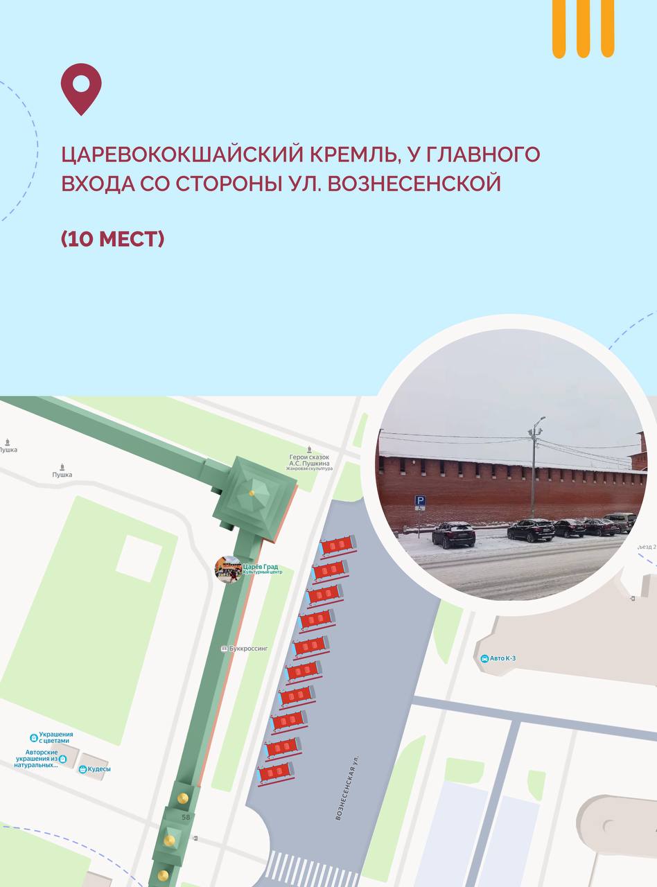 5. Царевококшайский кремль (у главного входа со стороны ул. Вознесенской): площадка на 10 мест.