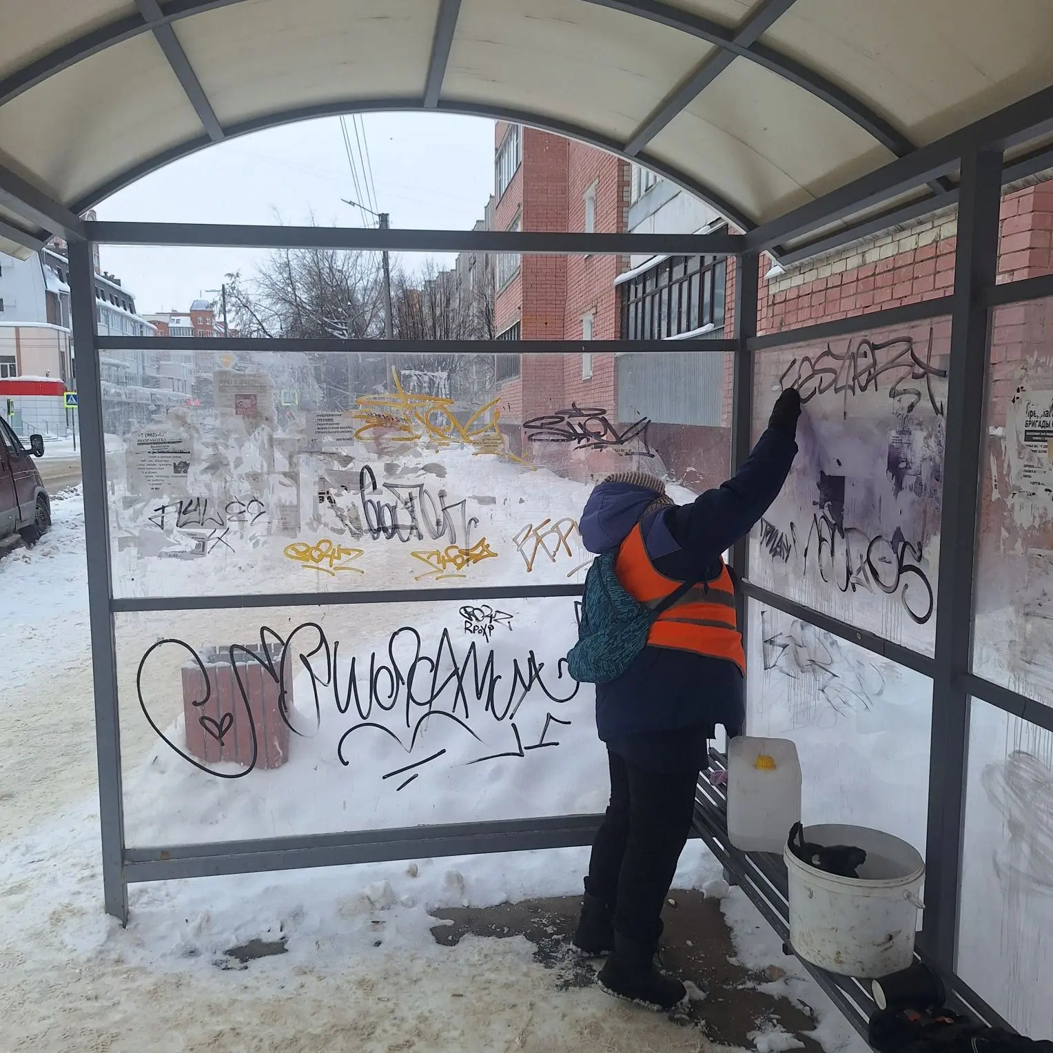В Йошкар-Оле вновь часами оттирают остановки от художеств вандалов