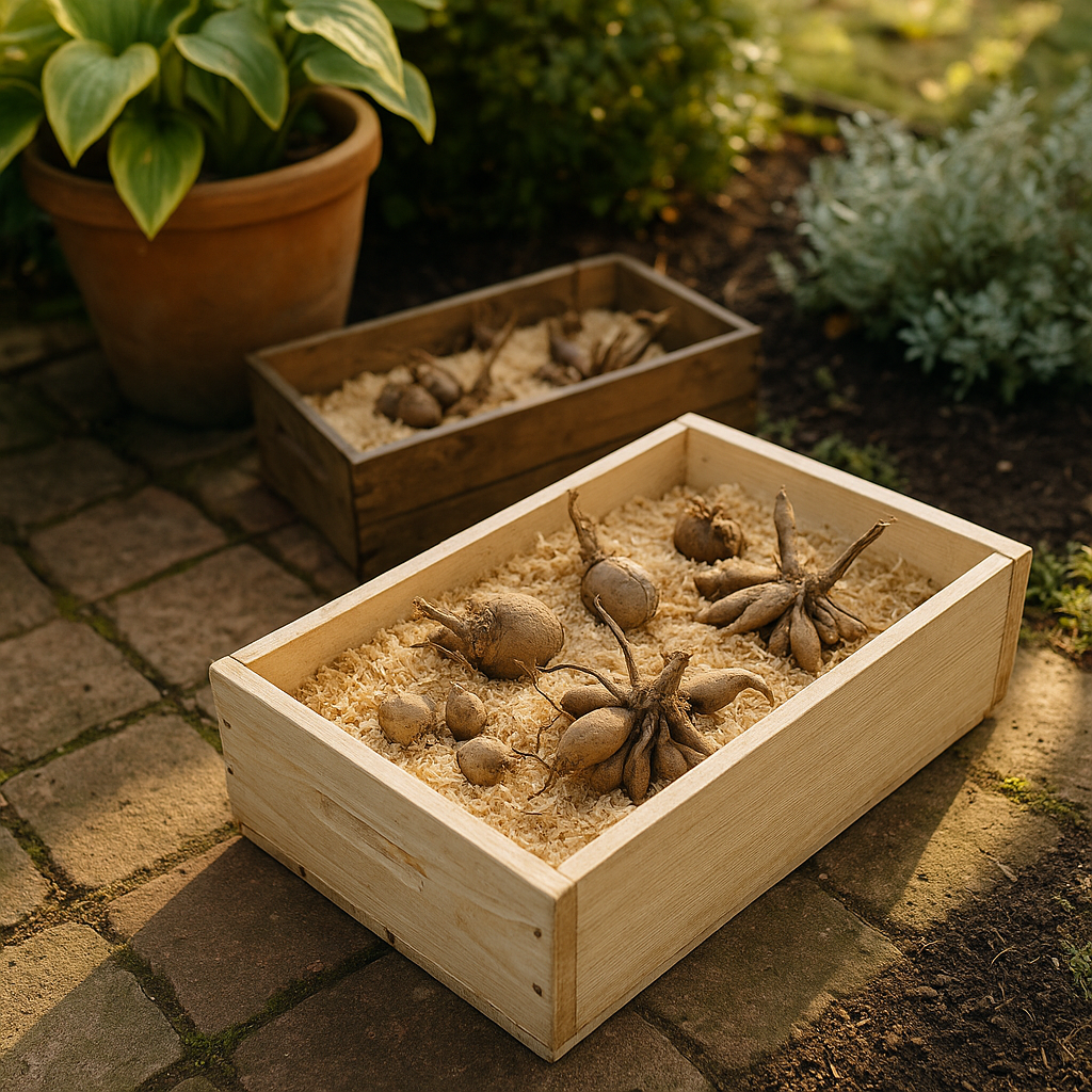 - Георгины. После обрезки и просушки клубни помещают в ящики с сухими опилками.