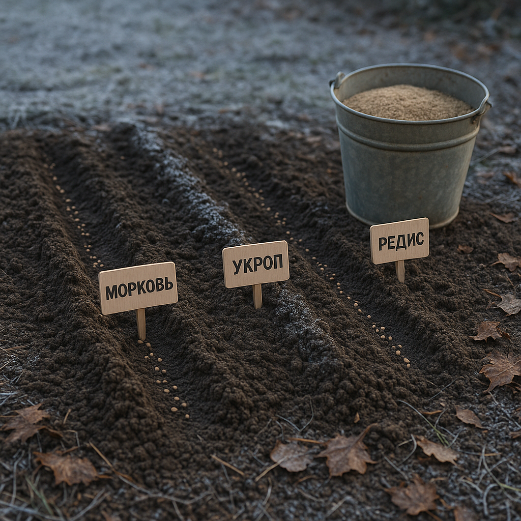 - Морковь: Сажается в начале ноября в холодную землю. Используются ранние сорта, такие как "Нантская" и "Лосиноостровская".