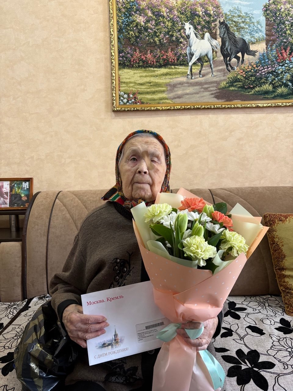 В годы Великой Отечественной войны Елена Андреевна своим самоотверженным трудом в тылу внесла вклад в общую Победу. В знак глубокого уважения и признательности ей передали персональное поздравление от Президента Российской Федерации Владимира Путина, а также цветы и памятный подарок.