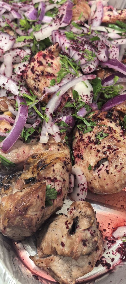 Пока мясо маринуется, готовится важный штрих, превращающий шашлык в осеннюю симфонию. Красный лук нарезается полукольцами и немного мнется с солью, а затем добавляется сумах — пряность с кисловатым вкусом, которая не только убирает горечь, но и придаёт цвет и аромат. Так на тарелке появляется осенний пейзаж — яркий, вкусный и солнечный.