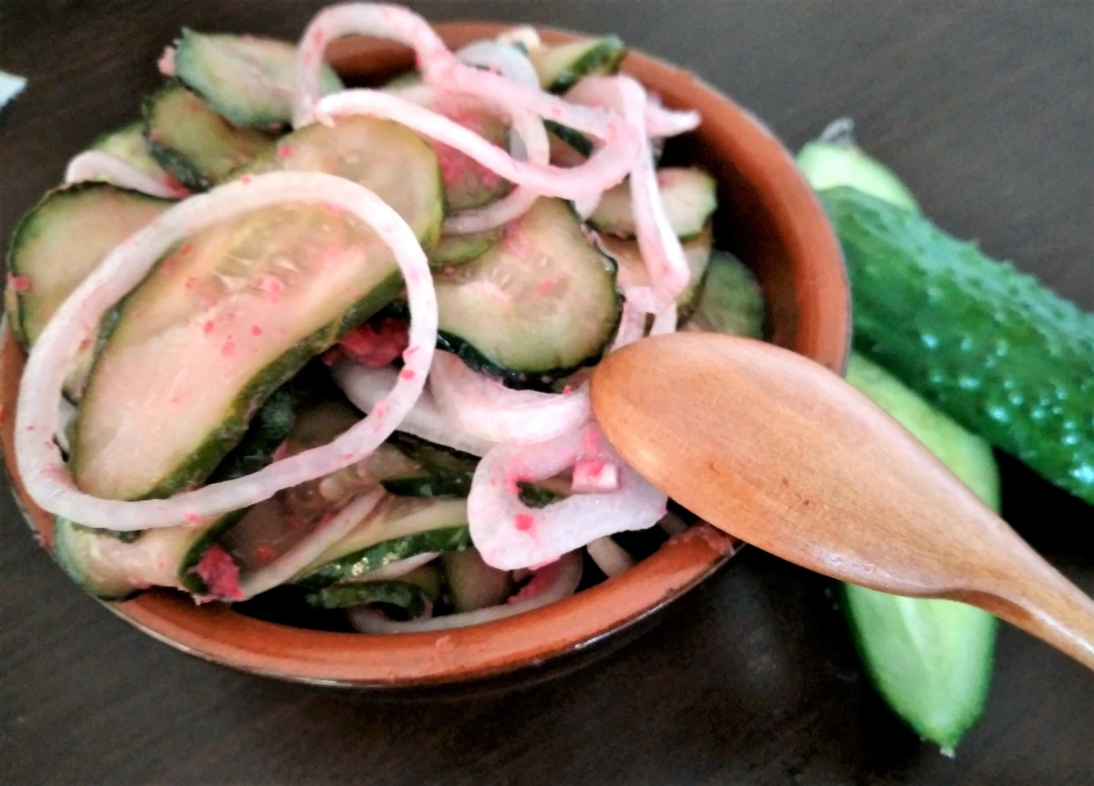 Для начала огурцы нужно тщательно промыть и нарезать на колечки, хотя можно выбрать любой другой удобный способ нарезки. Лук следует нарезать тонкими кольцами. Затем в подходящей емкости смешиваются огурцы с луком, добавляется хрен, вода, уксус, соль и сахар.