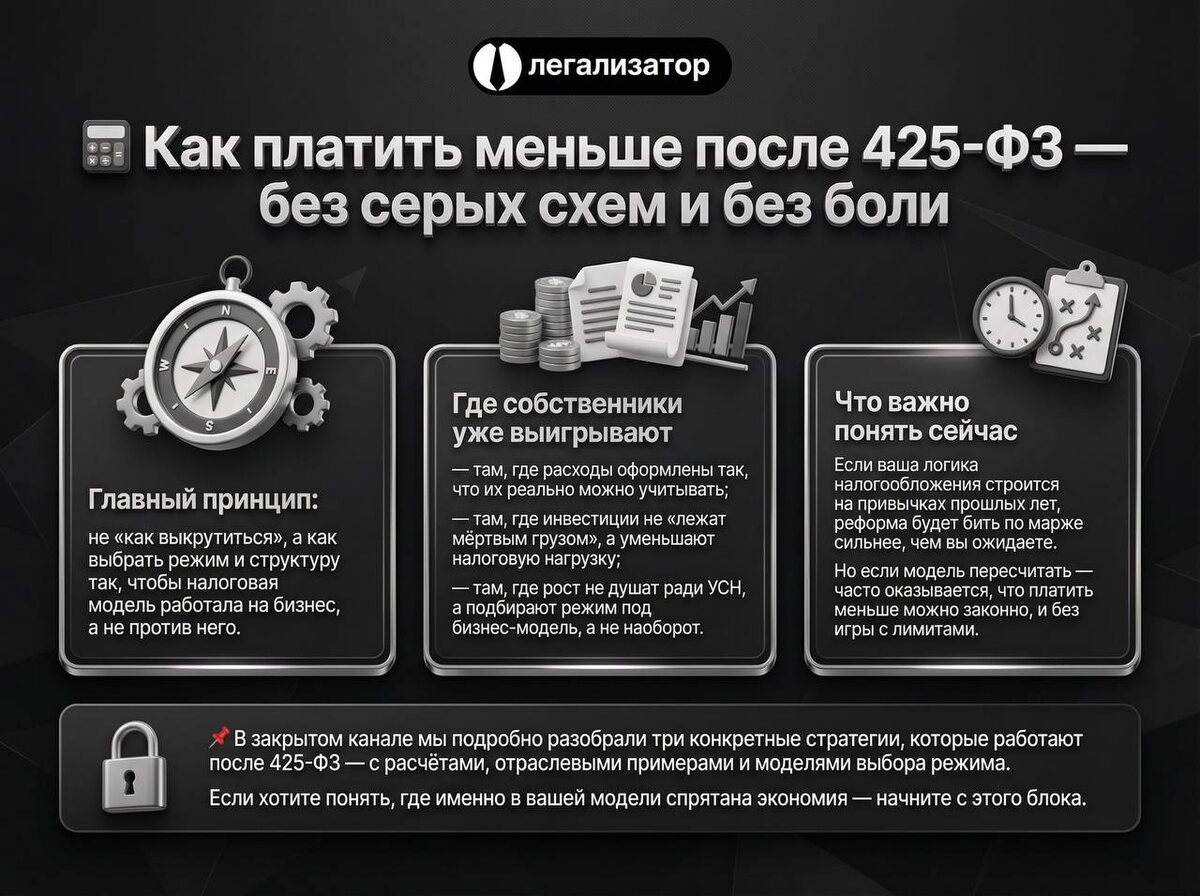 В специализированном канале представлены три конкретные стратегии, которые эффективно работают после применения 425-ФЗ. Эти стратегии содержат расчеты, примеры из разных отраслей и модели выбора наиболее подходящего режима. Тем, кто заинтересован в поиске налоговых возможностей своей модели, стоит начать с этого раздела.