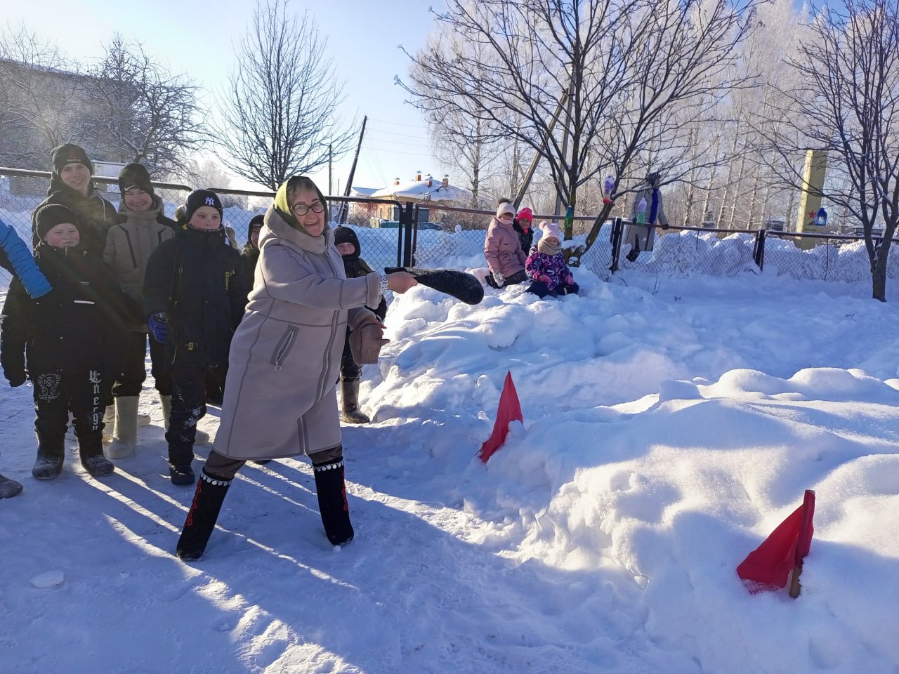 На улице развернулись спортивные состязания: лыжные гонки, метание валенок и даже хоккей метлами на снегу.