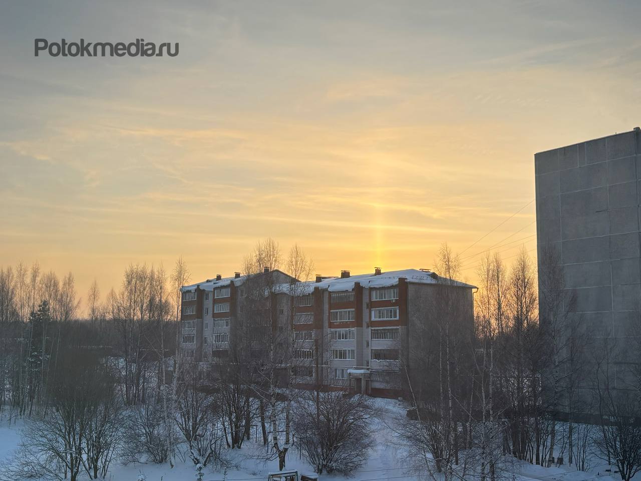 В Йошкар-Оле на фоне утреннего мороза на небе видны солнечные столбы.