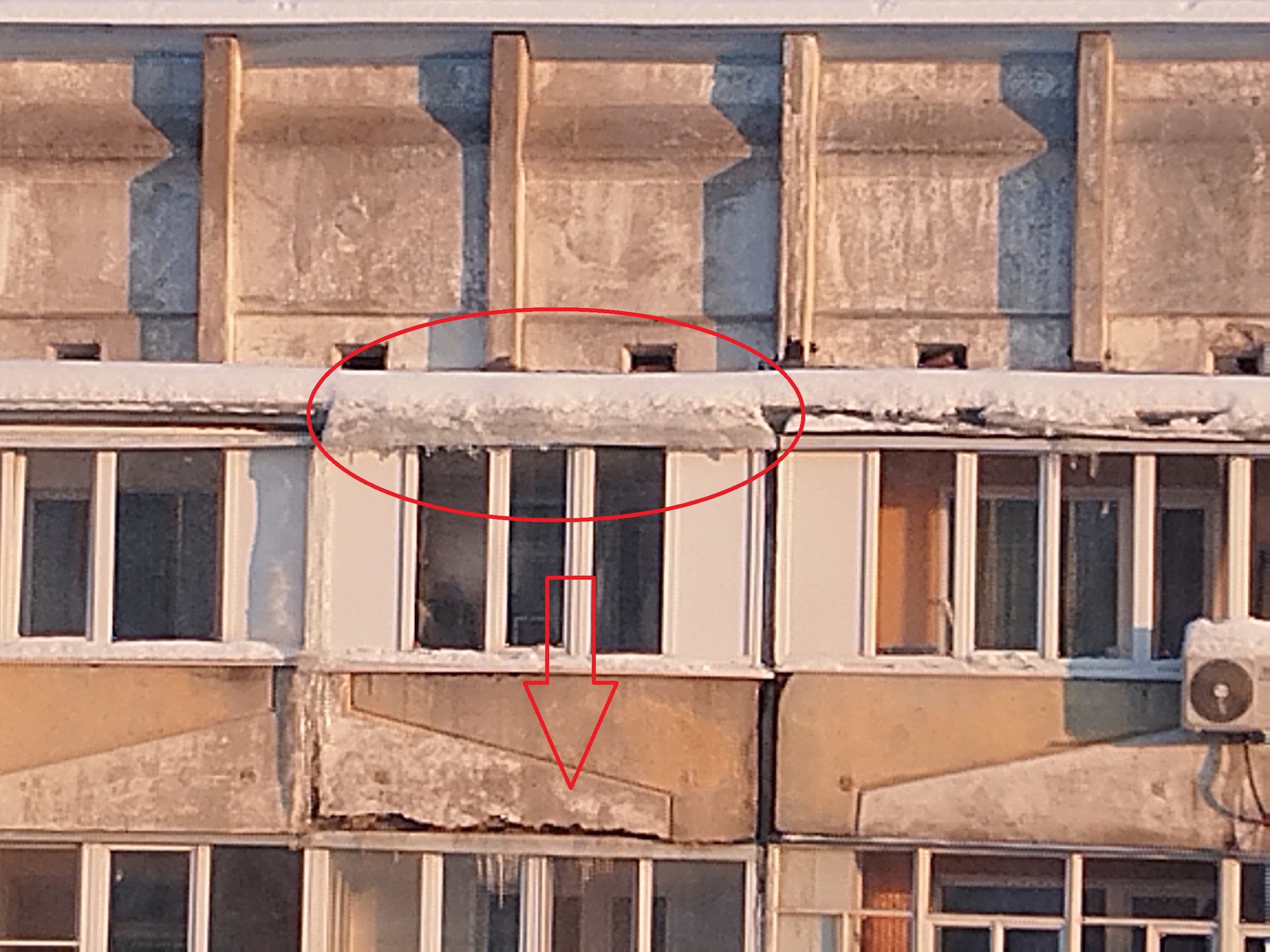 С первого взгляда сложно разглядеть на одной из балконных крыш снежный накат. Но, тем не менее, если он сорвётся, то как раз упадёт перед аркой, где ходят люди и ездят машины.