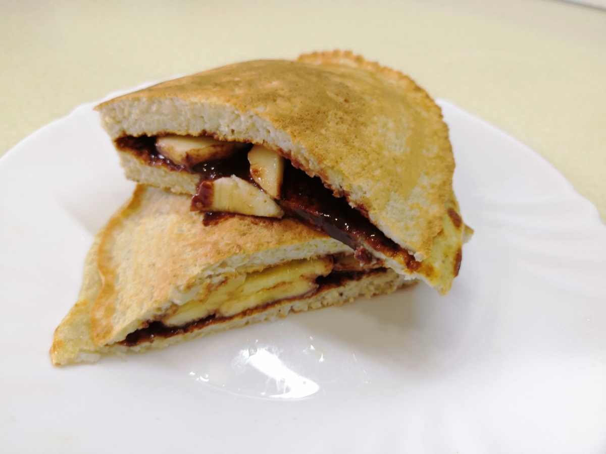 Глазурь делают просто: плавятой шоколад с молоком до гладкости, не доводя до кипения. Банан нарезать ломтиками. Блин разрезать пополам, намазать глазурь на одну половину, уложить банан и закрыть второй половинкой. Приятная сладость готова, а утро становится чуть теплее.