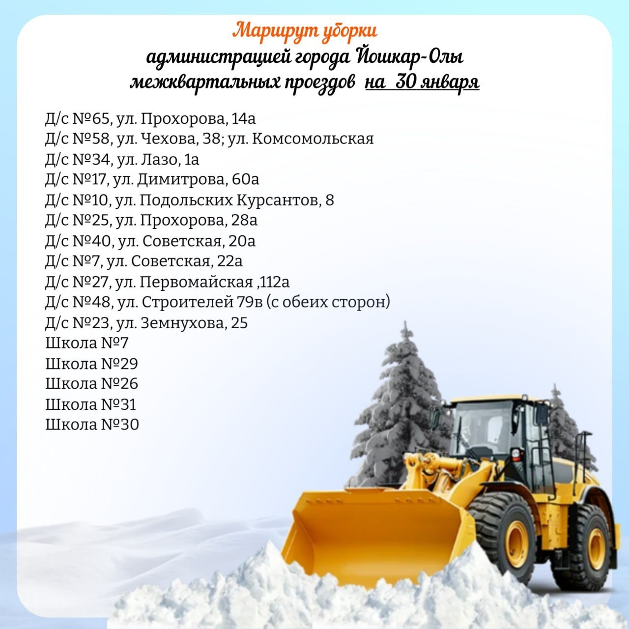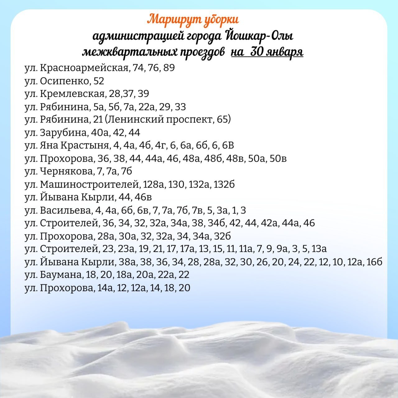 Мэрия Йошкар-Олы опубликовала план движения снегоуборочной техники по расчистке межквартальных проездов на 30 января 2026 года.