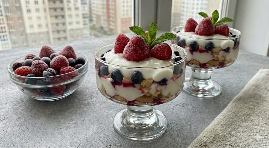 Оставьте готовый десерт при комнатной температуре на 1 час, чтобы ягоды оттаяли, а печенье впитало до краев соки и йогурт. Итог — невероятно нежная ягодная масса, заключенная в густую йогуртную заливку.
