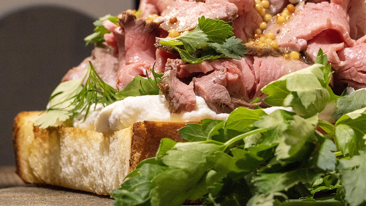 Нарежьте ростбиф тонкими ломтиками, на хлеб намазывайте творожную массу, добавьте зелень и ломтики мяса, затем полейте апельсиновой заправкой. Наслаждайтесь!