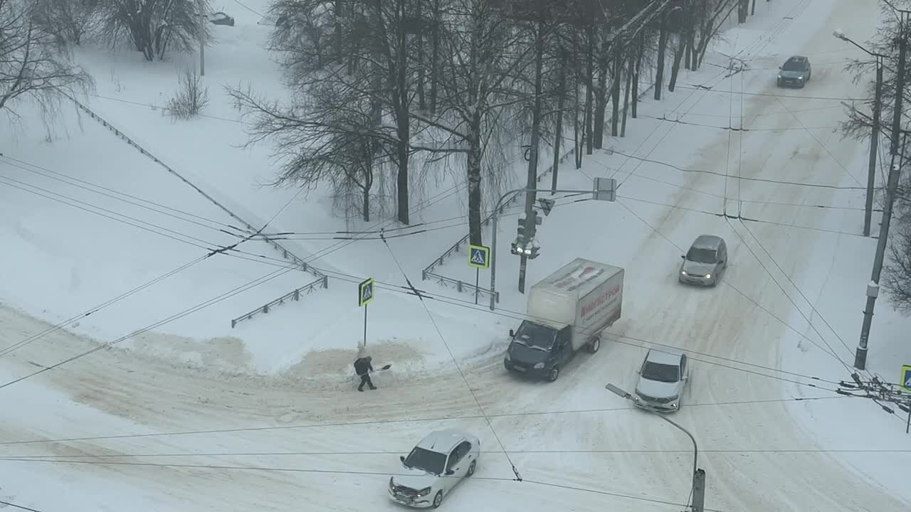 Мужчина расчищает проезжую часть на перекрестке Мира - ГСБ: здесь чаще всего буксуют троллейбусы.