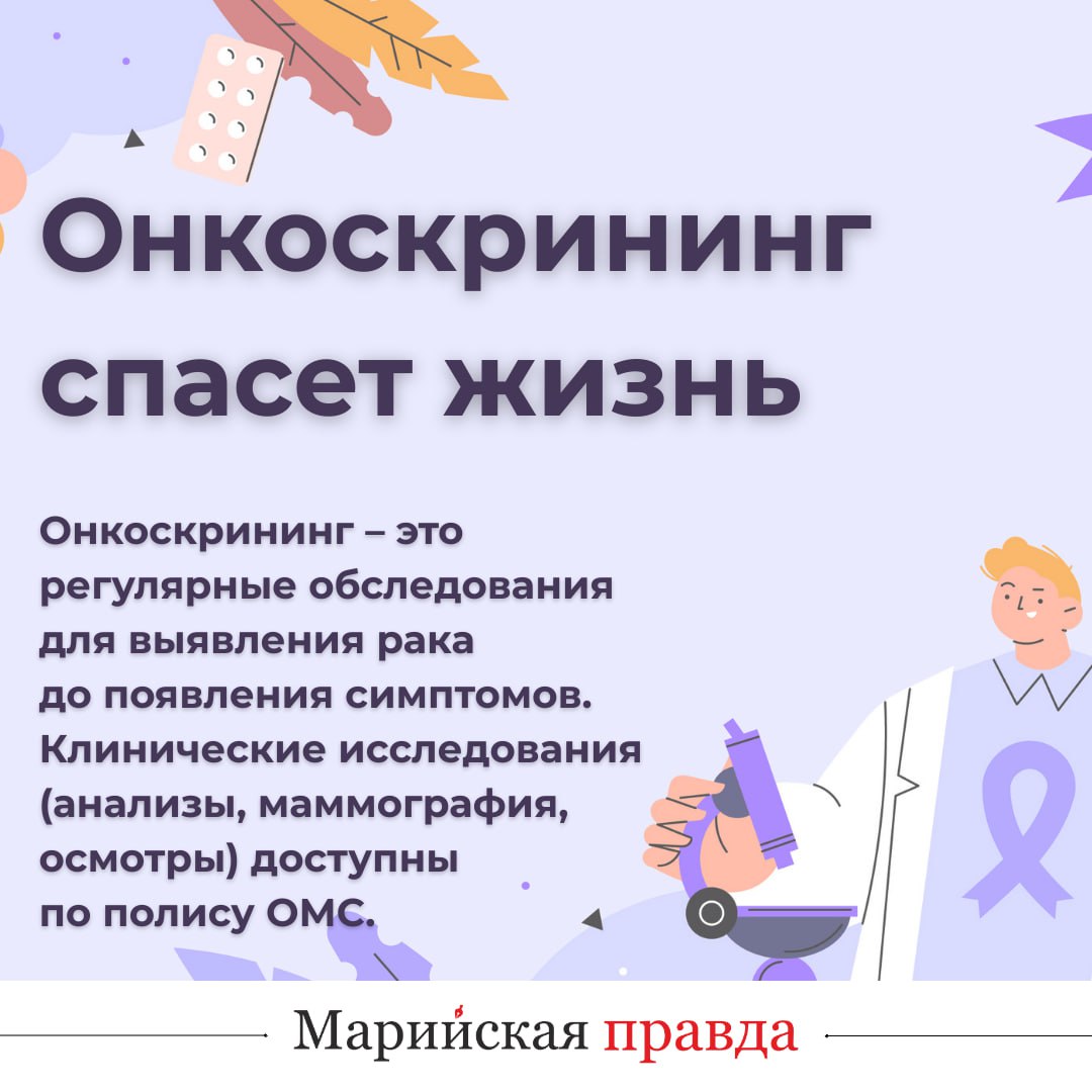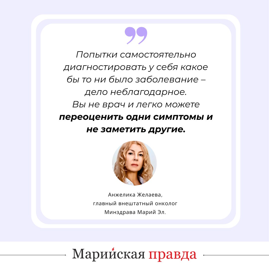 Главный внештатный онколог Минздрава Марий Эл Анжелика Желаева напоминает: лучший способ позаботиться о своем здоровье – регулярно проходить онкоскрининги.