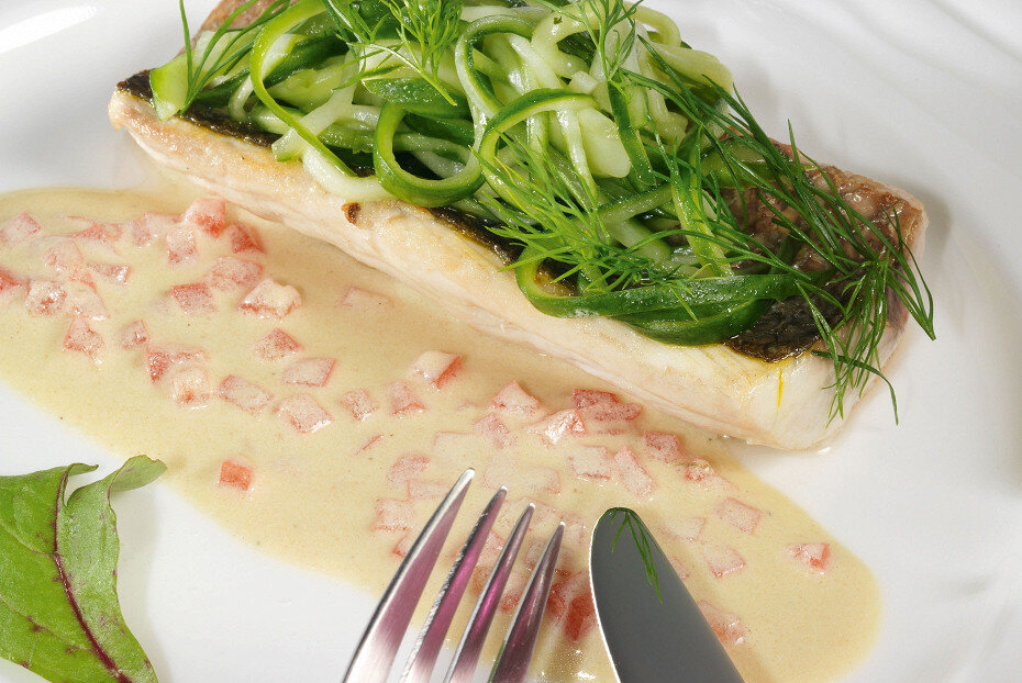 Филе кефали нарезать на порционные куски по 200 г. Мякоть помидоров нарезать кубиками, а огурцы — соломкой.Уварить белое вино на среднем огне до уменьшения объема наполовину. Затем добавить куриный бульон и продолжать варить еще 20 минут, до загустения. Вмешать в соус сливочное масло, предварительно измельченное, и добавить помидоры. Посолить и поперчить по вкусу.Обжарить филе кефали на растительном масле по 2 минуты с каждой стороны, предварительно посолив и поперчив. Затем поставить в духовку, разогретую до 160 градусов, на 5 минут.На оставшемся масле, смешанном с медом и мелко нарезанным чесноком, обжарить огурцы на медленном огне. В конце добавить укроп и тщательно перемешать.Подавайте кефаль с соусом и гарниром из жареных огурцов, наслаждаясь ярким вкусом и ароматами этого блюда.Не упустите возможность поделиться этим великолепным рецептом с друзьями! Готовьте вместе и пробуйте новые вкусы!