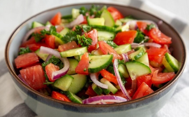 - Огурцы без лишней влаги. Чтобы избежать чрезмерной влаги в салате, переросшие огурцы можно подсолить и сбрызнуть уксусом на 10-20 минут. Это также поможет сделать их более хрустящими.