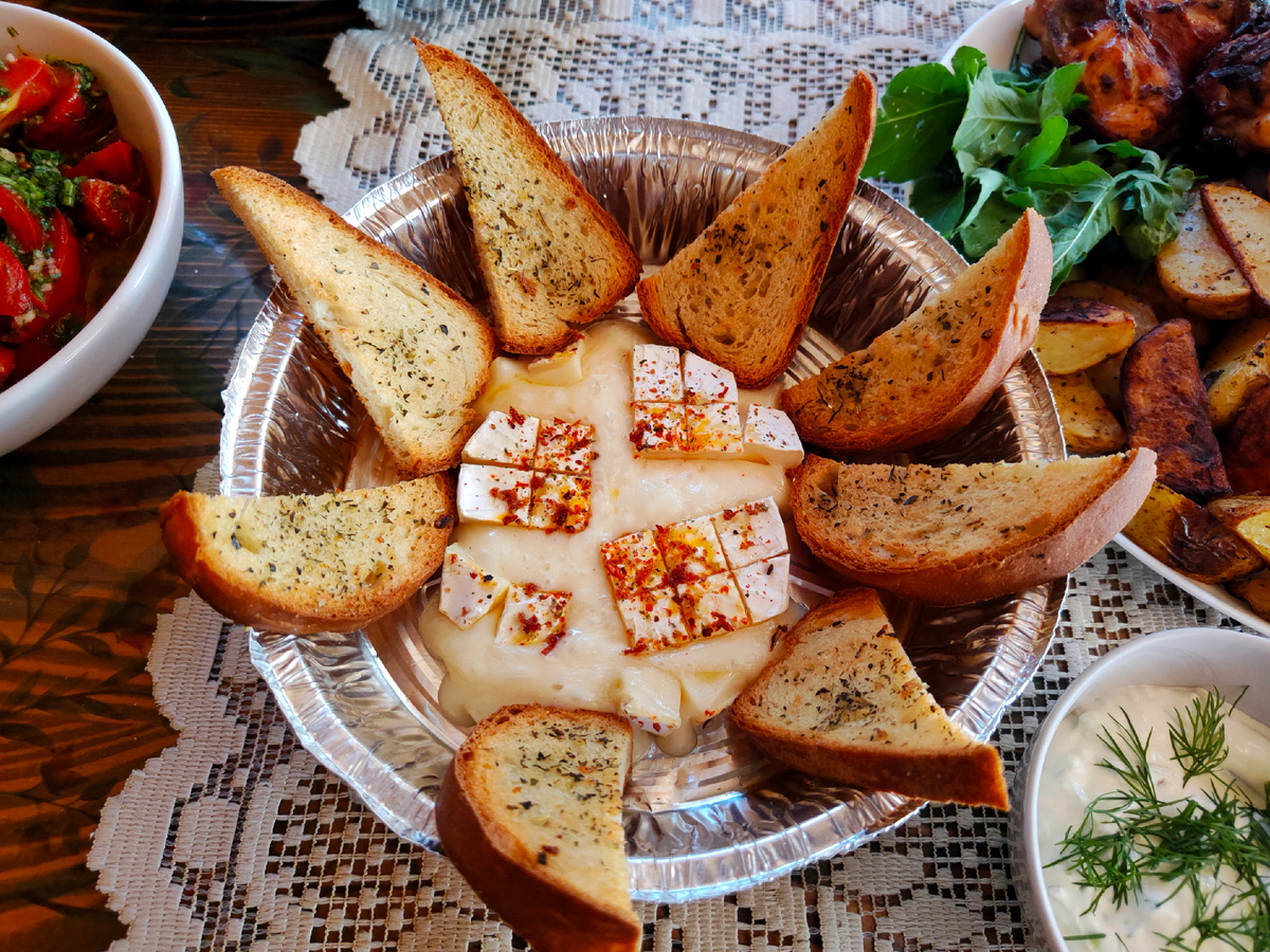 - Второй: запеките сыр на решётке над мангалом, а гренки положите отдельно на решётку.