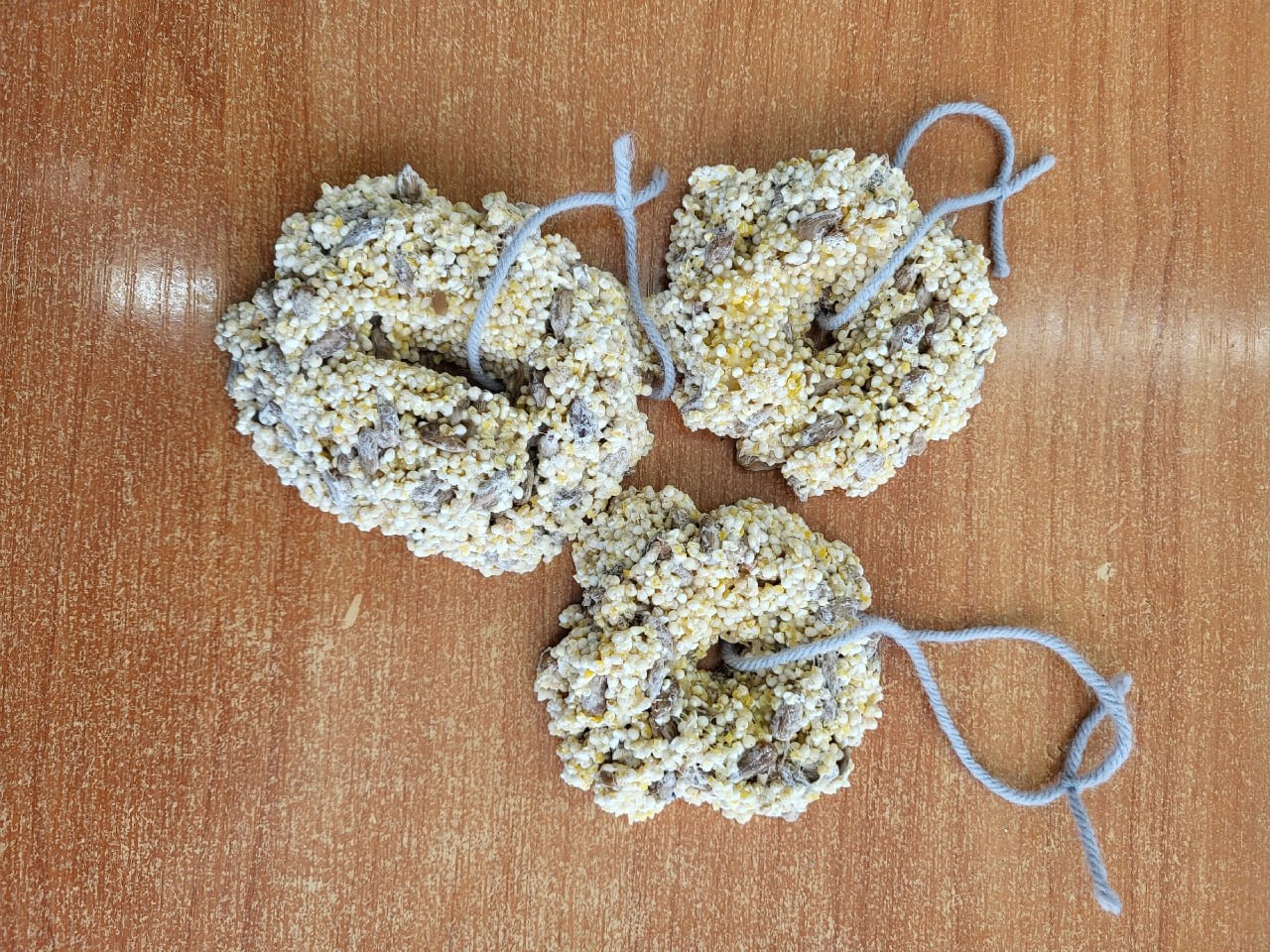 Юные волонтеры, ученики первых и вторых классов школы вместе с наставниками смастерили кормушки и зерновые кольца для птиц и установили на деревьях.