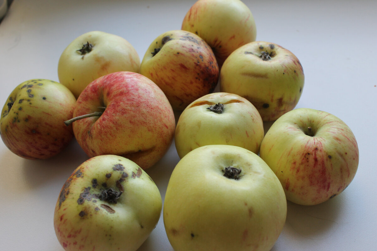 Эти самые яблоки из Хотьково не идеальны на них есть пятнышки, но это лишь добавляет им характер. Их тщательно моют и очищают, оставляя только сердцевину и хвостик. В итоге остается около 1050 г чистых яблок. Для удобства нарезки яблоки делят на две части.