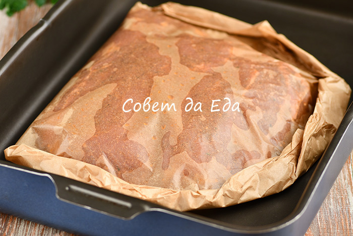 Пергамент складывают пополам и помещают его в форму, сверху укладывают свинину. Закрывают нижнюю половину пергамента верхней и плотно сворачивают края. Запекаем в разогретой духовке 60 минут. Такой способ позволяет сохранить все соки внутри, поэтому мясо получается не только румяным, но и очень нежным.