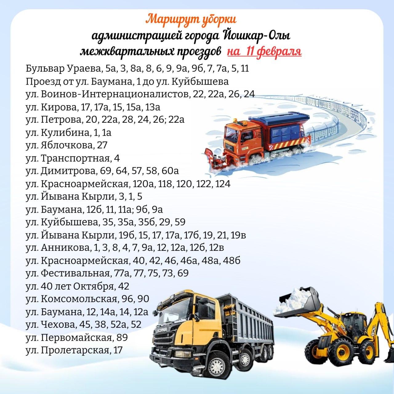 Мэрия Йошкар-Олы опубликовала планируемый маршрут движения снегоуборочной техники по расчистке межквартальных проездов на 11 февраля.