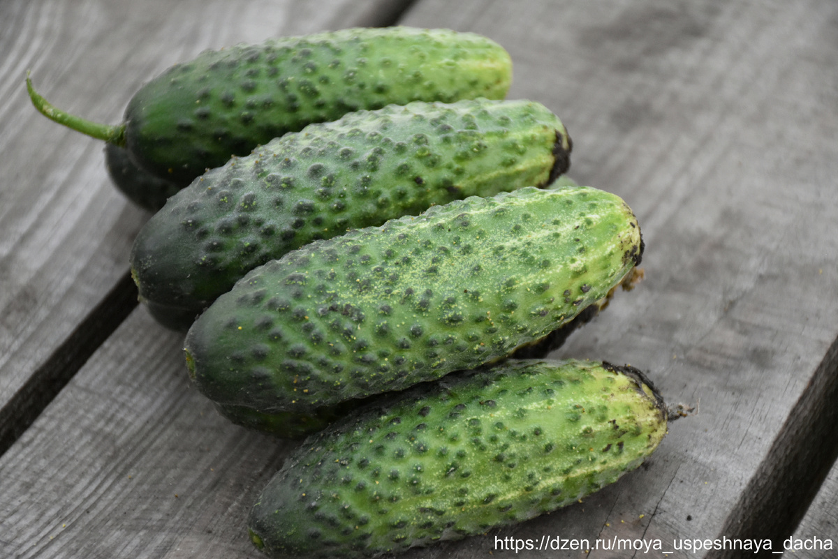 - Форма плодов: Цилиндрические огурцы длиной 9-11 см и диаметром около 3 см с пупырчатой кожурой.