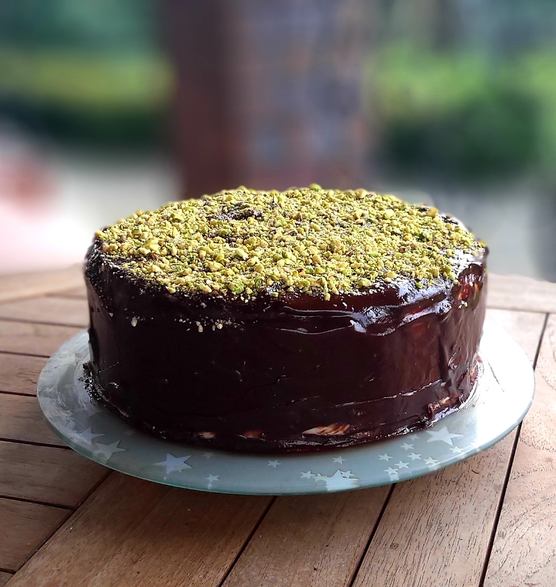 После застывания, торт освобождается от пленки, накрывается блюдом и аккуратно переворачивается. Затем готовится глазурь: растопленный шоколад смешивается со сливками и маслом. Полученная глазурь равномерно выливается на торт, после чего он посыпается дроблеными фисташками и ставится в холодильник для окончательной стабилизации.