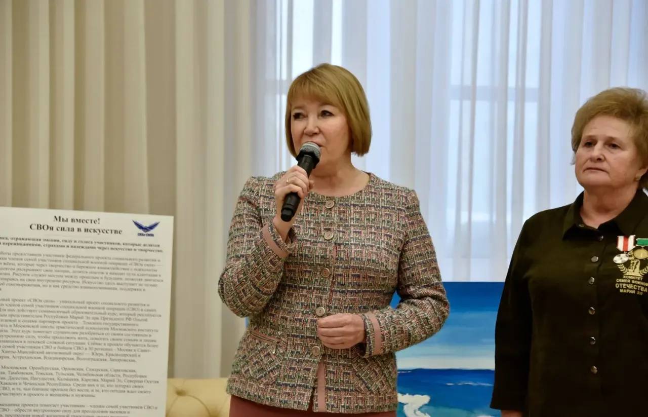 Перед началом заседания гости ознакомились с выставкой «Мы вместе! СВОя сила в искусстве», на которой представлено 30 работ матерей, жён, сестер участников СВО из разных регионов России, в том числе и нашей республики.