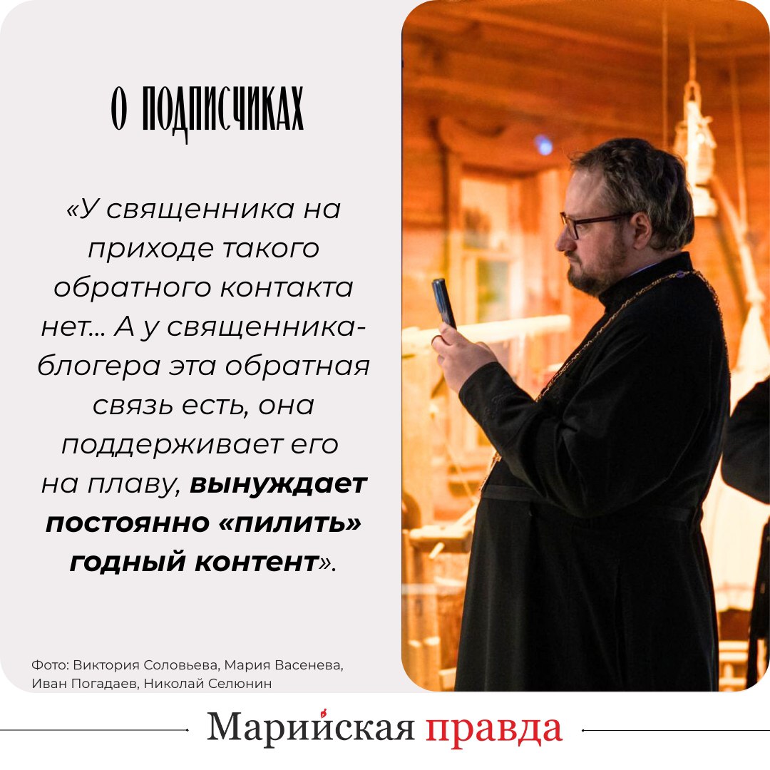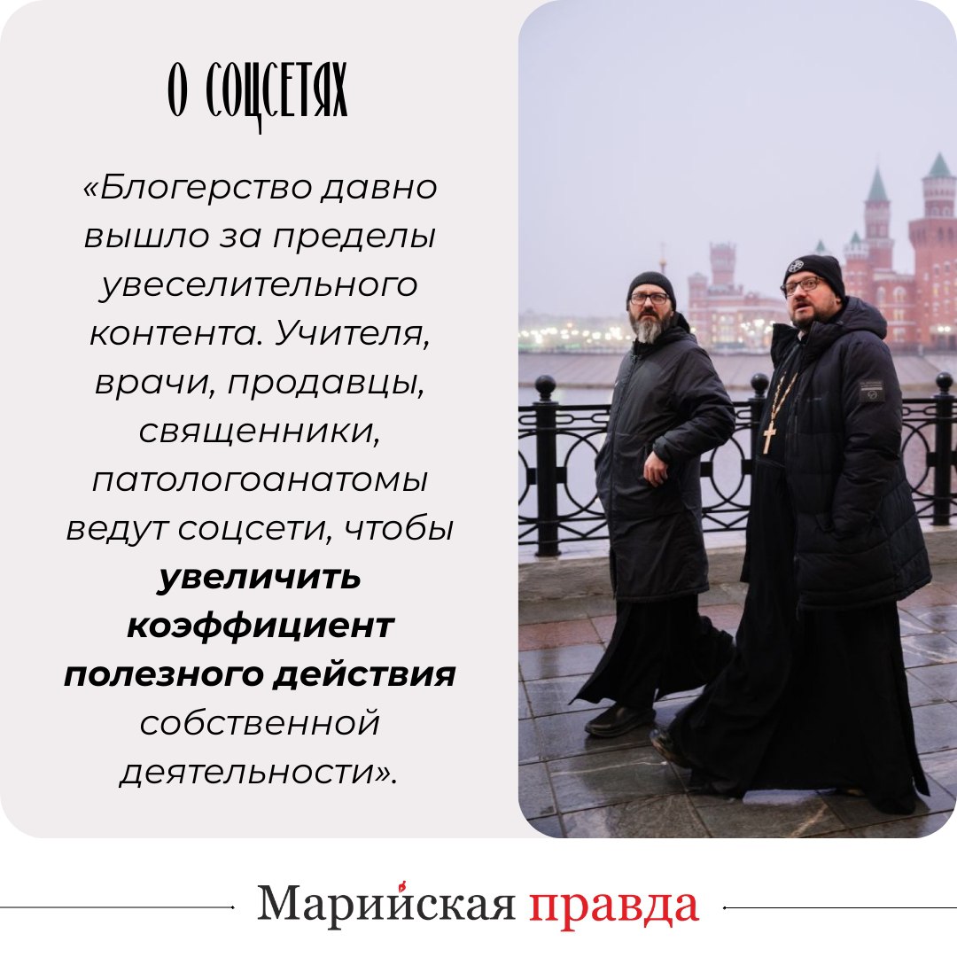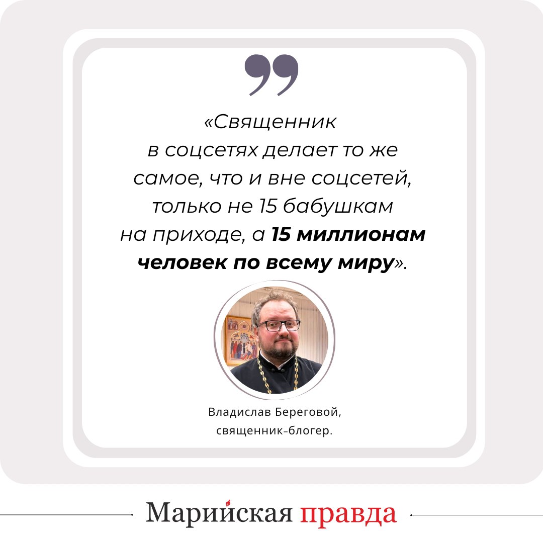 Страница в соцсети – не храм и не монастырское подворье, но, оказывается, здесь тоже можно пообщаться с православным священником. О чем и как – об этом и многом другом рассказал недавний гость Йошкар-Олинской епархии, популярный священник-блогер с огромным числом подписчиков Владислав Береговой. К слову, два года назад его канал стал победителем фестиваля «Вера и слово» в номинации «Лучший просветительский Telegram-канал».