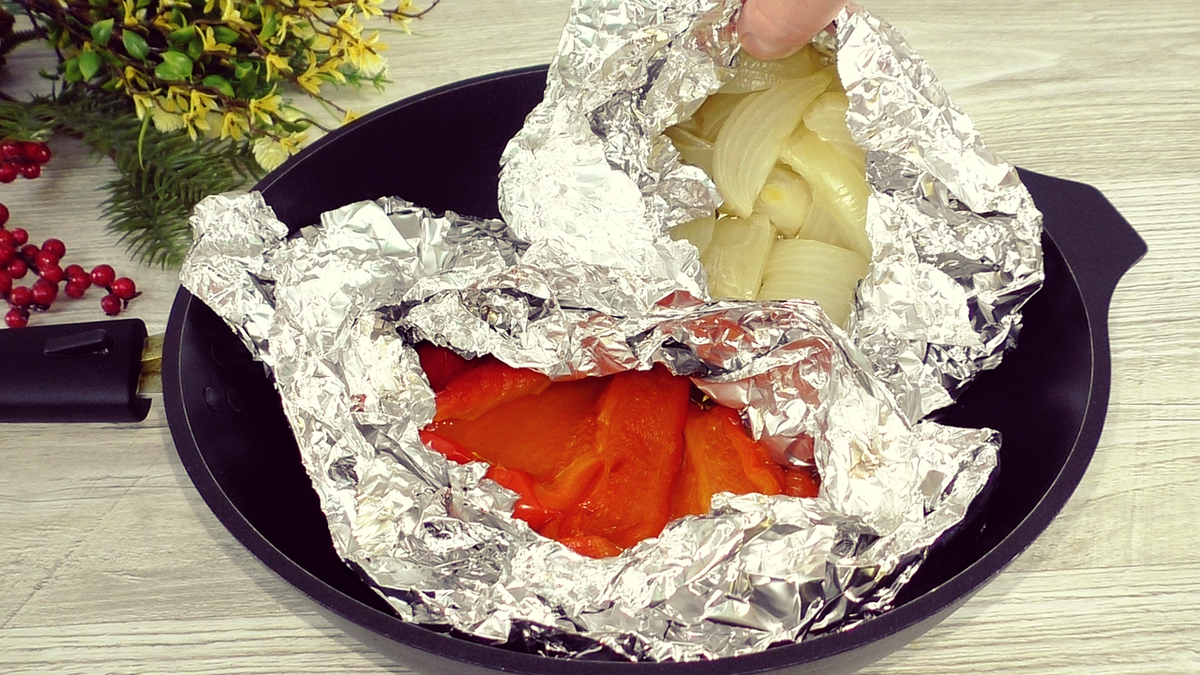 Для начала превратите перцы в идеальную основу. Разрежьте их пополам и удалите семена. Лук очистите и нарежьте крупными кусками — так он усилит вкус салата. Заверните все в фольгу и положите в заранее разогретую до 200 градусов духовку. Запекайте около 40-50 минут. Не забудьте, что можно использовать не только противень, но и форму для запекания, или даже сковороду с съемной ручкой.