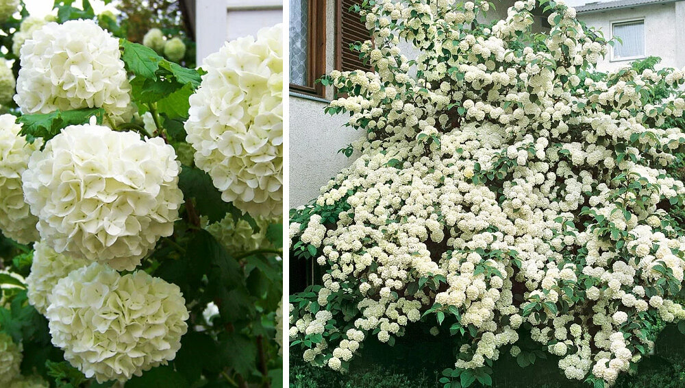 Этот сорт, известный как Снежный шар, завоевал популярность благодаря своим огромным соцветиям и резной листве. Высота за растения варьируется от 3 до 4 метров, а летом калина покрывается около 500 белыми цветами диаметром до 15 см.