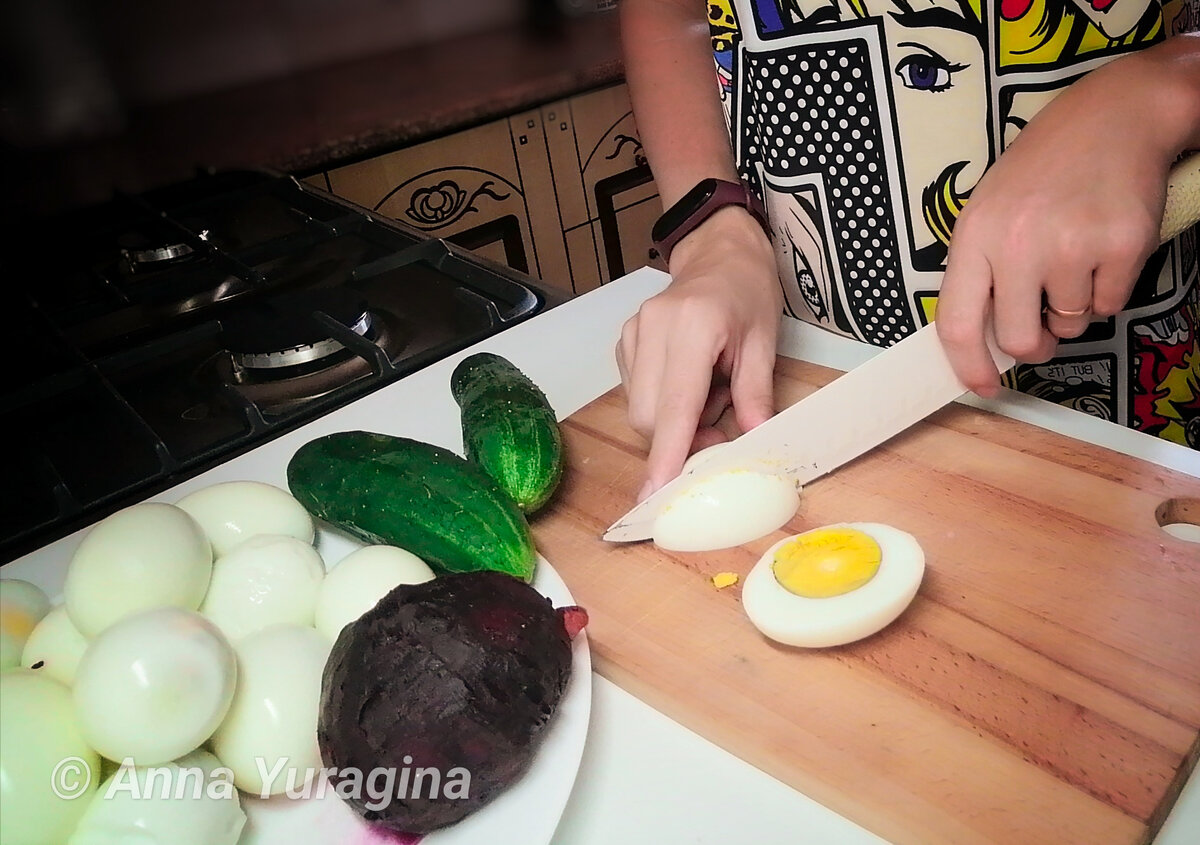 Свёклу можно отварить, однако запекание в духовке придаст ей более насыщенный вкус. Далее яйца отвариваются и нарезаются кубиками. Для большой порции можно увеличить количество ингредиентов вдвое или даже втрое.