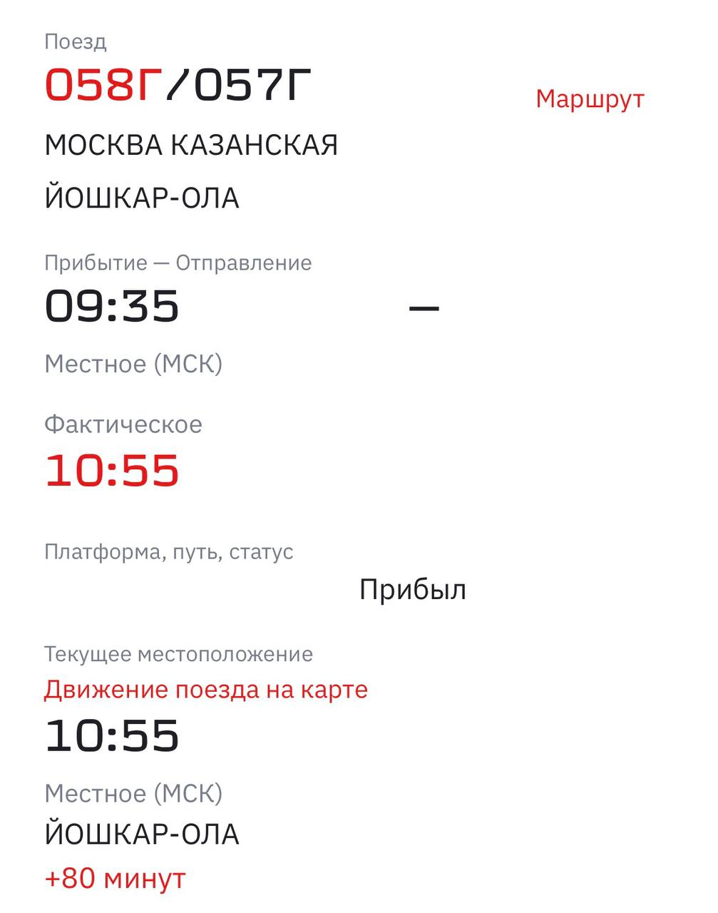 Поезд 058Г Москва - Йошкар-Ола прибыл в столицу Марий Эл с опозданием на 80 минут. По графику состав должен был приехать 09:35, но фактически прибыл в 10:54, следует из онлайн-табло РЖД.