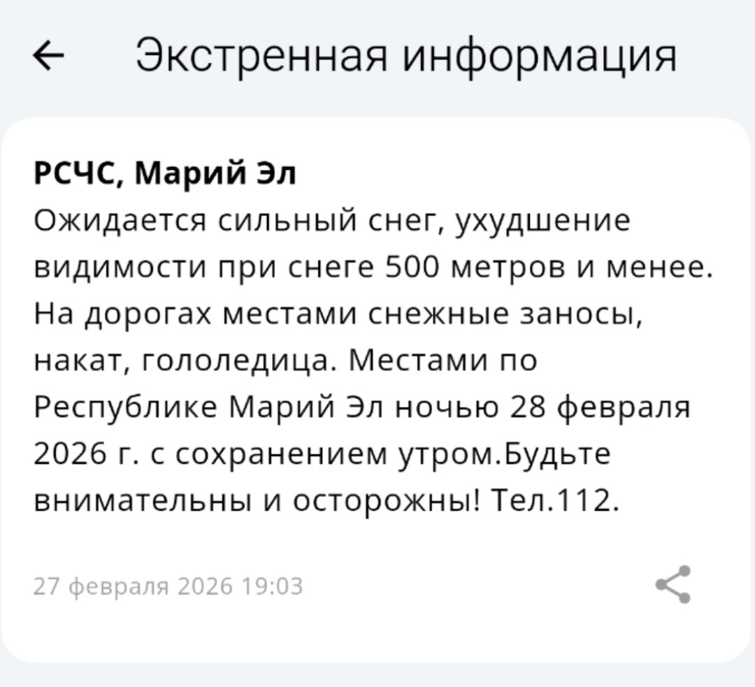 По данным регионального управления РСЧС, ночью 28 февраля (с сохранением утром) в республике ожидается сильный снег. Видимость на дорогах ухудшится до 500 метров и менее. На трассах возможны снежные заносы, накат и гололедица.