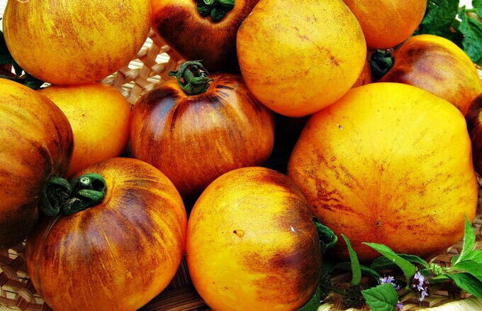 Причина яркой расцветки двуцветных помидоров заключается в особых пигментах, которые образуют на их кожице завораживающие узоры: полоски, разводы и точки. Они не только красиво смотрятся, но и радуют гурманов необычными вкусовыми оттенками.